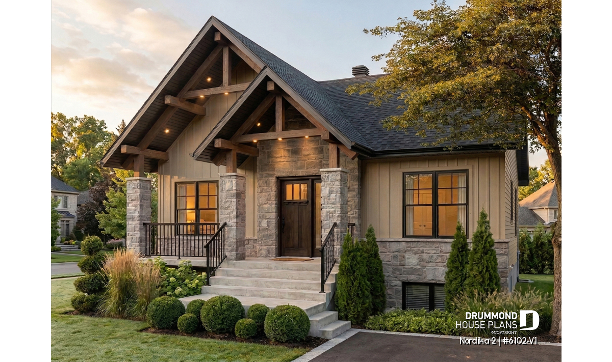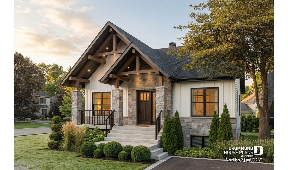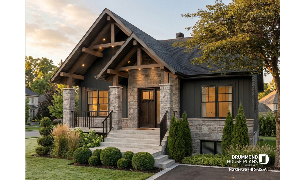 The NORDIKA 2 house plan (6102-V1) is as surprising as it is stylish, showcasing strong modern-rustic appeal both inside and out. Measuring 1,020 sq.ft. on the main level, this elegant home stands out with its impressive façade, featuring over 50% masonry and bold timber gables that instantly create character and presence. The rustic charm continues indoors, where beautiful exposed wood beams echo the architectural accents found on the exterior.