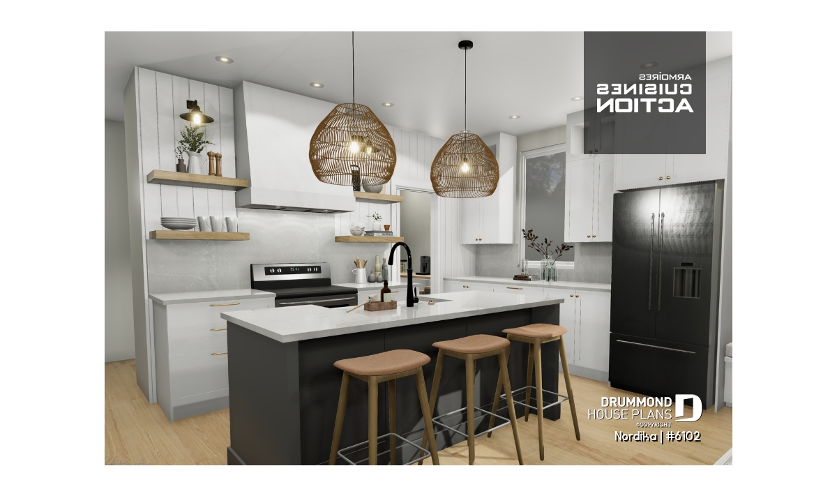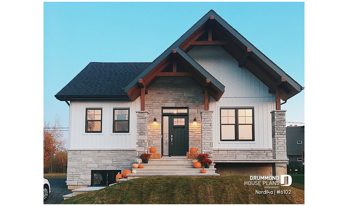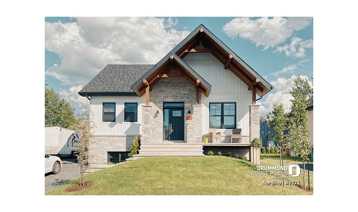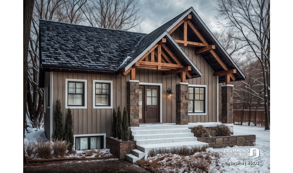 The NORDIKA (6102) is a modern rustic farmhouse bungalow designed to deliver maximum charm, comfort and functionality within a beautifully efficient footprint. Whether you’re looking for your first home, downsizing in style, or planning a cozy family nest, this thoughtful layout adapts naturally to a wide range of lifestyles. Offering 1 to 3 bedrooms and 1 or 2 bathrooms depending on the optional finished basement, this plan stands out for its warm aesthetics, smart storage solutions, and surprisingly spacious feel.