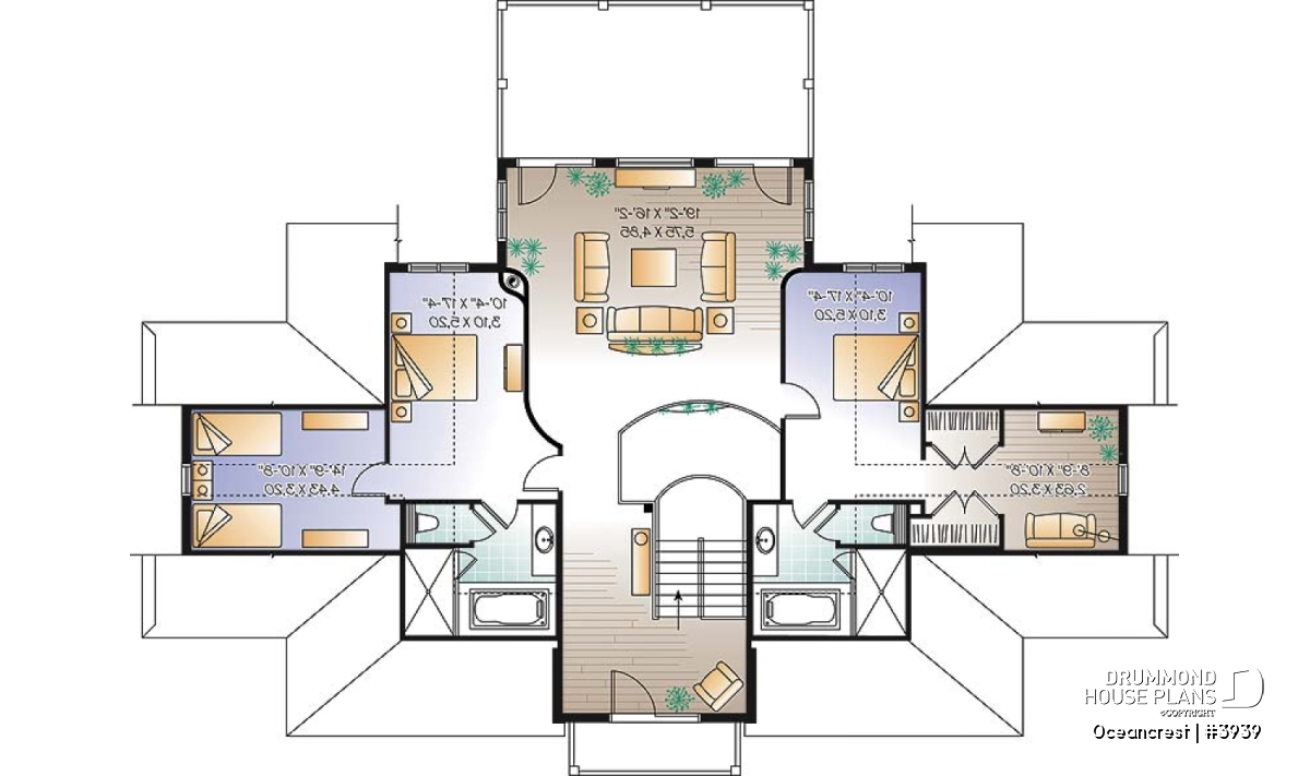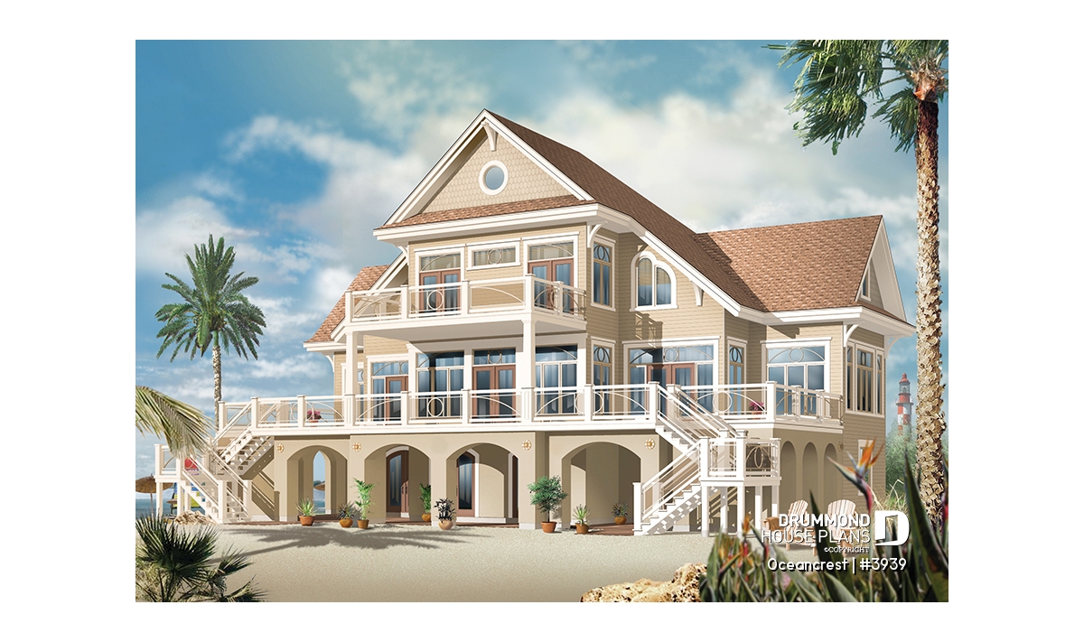 The upper floor features two bedroom suites, each with walk-in closets and private sitting area. A family room accesses a covered rear balcony or get away to a small forward balcony.