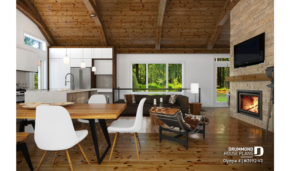 The heart of the home is the open-concept kitchen and living area, designed to encourage connection and family time. At its center stands a grand fireplace, a distinctive feature of this plan. The proposed STÛV s16-Z wood-burning fireplace combines performance with elegant design. It brings warmth and a cozy, Scandinavian-inspired ambiance to winter evenings while blending seamlessly into the chalet’s rustic-modern architecture. Visible from the entire main floor, it becomes the true focal point of the home, transforming every shared moment into a warm memory.