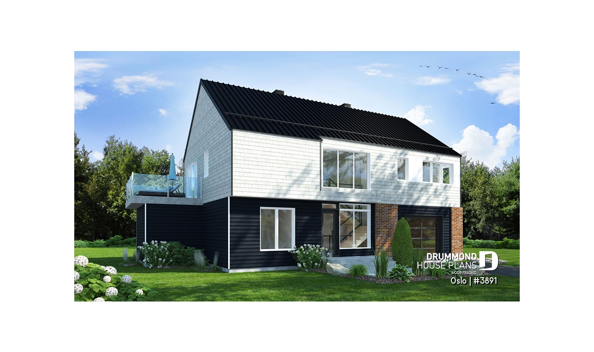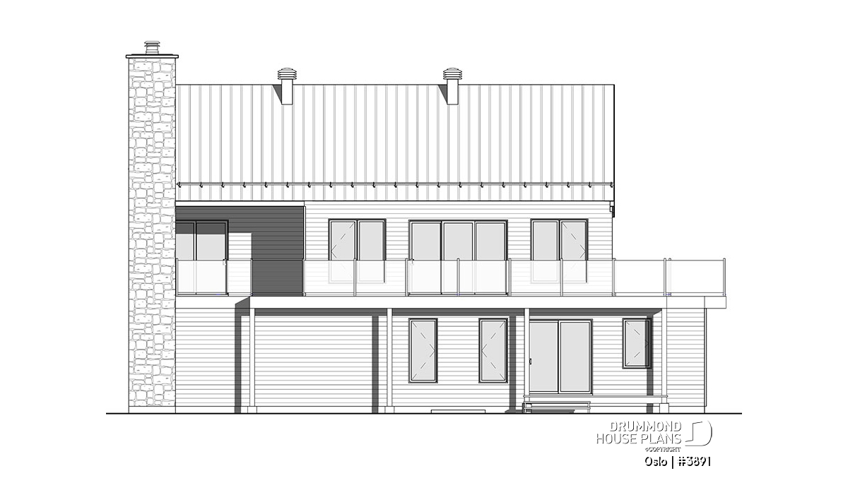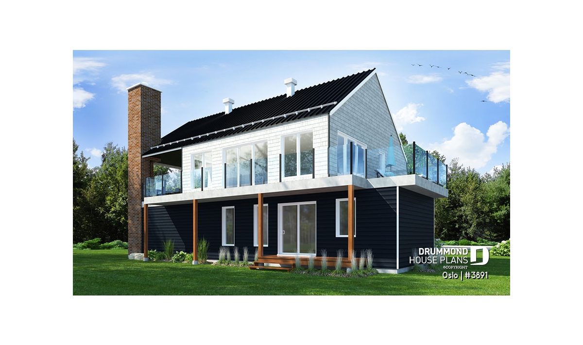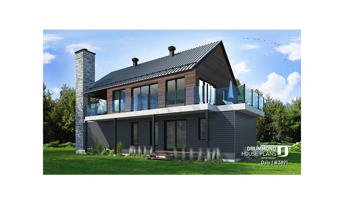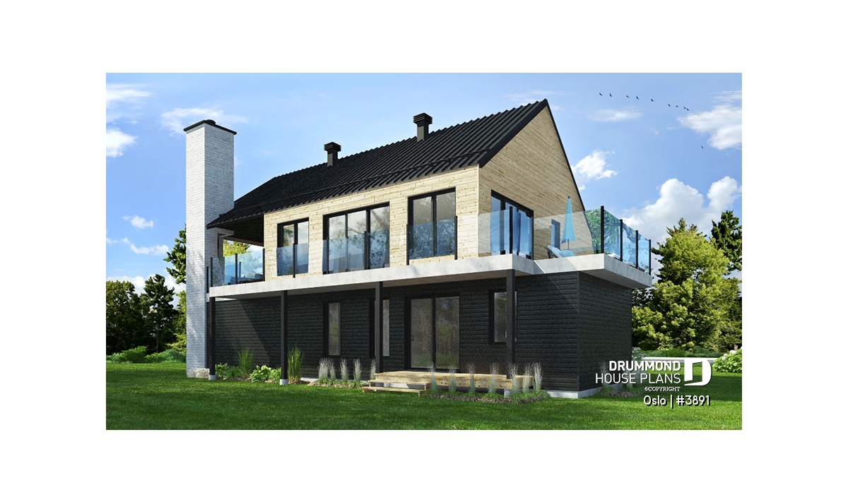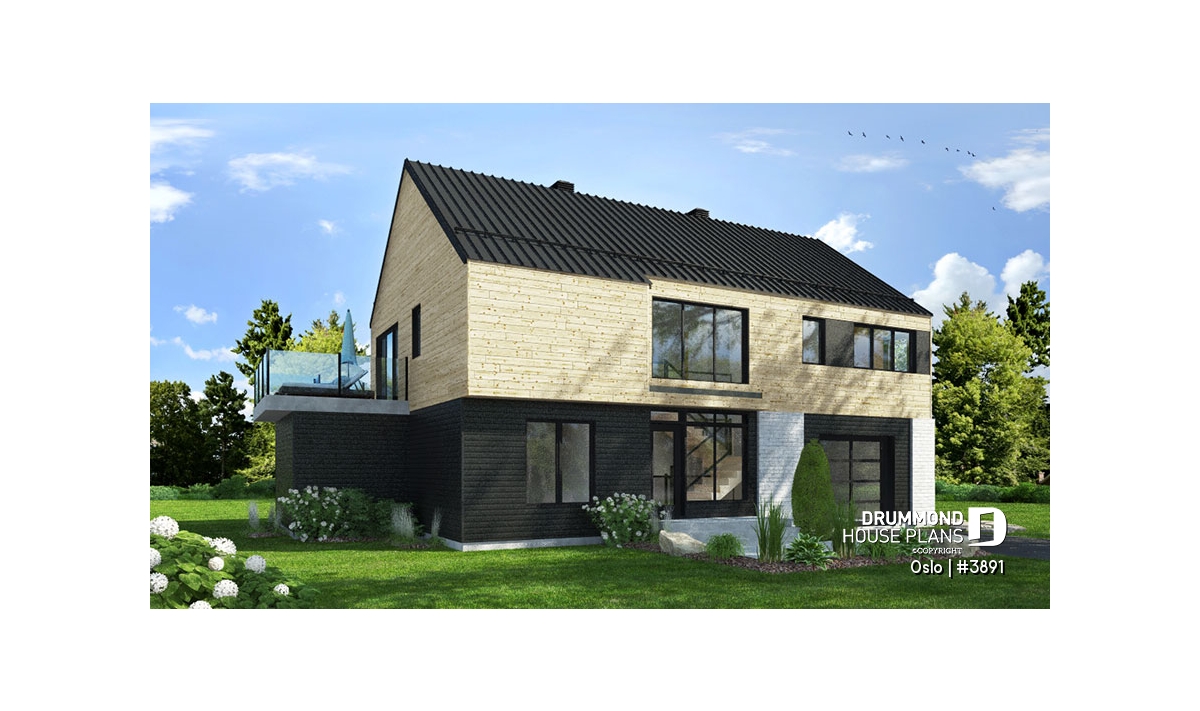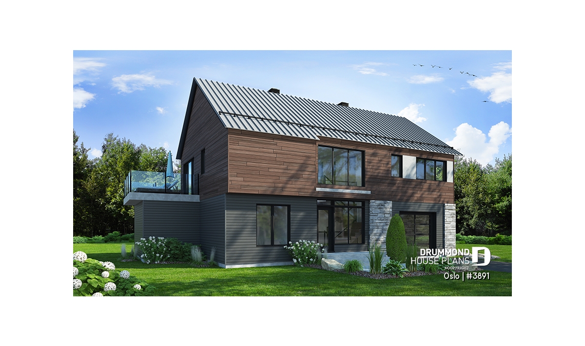 Modern Rustic house plan, Scandinavian-style inspired, new plan no. 3891 also called Oslo by Drummond House Plans, suggests a happy marriage of noble materials, rustic and warm at the same time. The featured item of this beautiful house is undoubtedly the generous terrace, partially sheltered upstairs, which provides an outdoor fireplace. This home design with garage will be perfect for a construction on a plot offering a panoramic view (lakefront), a mountain or a picturesque country landscape.