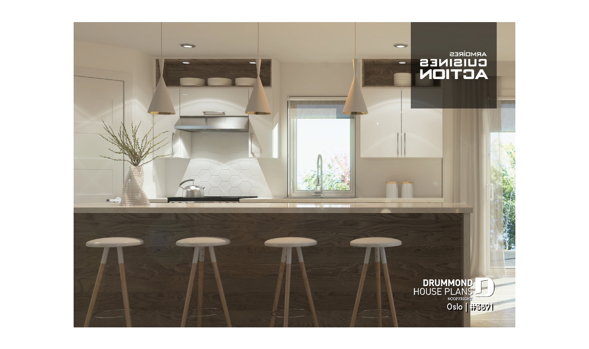 Unlike the vast majority of floor plan layouts, the two-storey Scandinavian model Oslo (plan # 3891) offers the bedrooms on the ground floor and common rooms on the second floor. The good size master suite has a walk-in closet and a full bathroom. In the latter, two sinks, a shower and a separate bath are provided. In addition, the master bedroom has patio doors that provide access to a small sheltered balcony. The two secondary bedrooms share a shower room. A laundry room and access to the garage complete this first floor.
