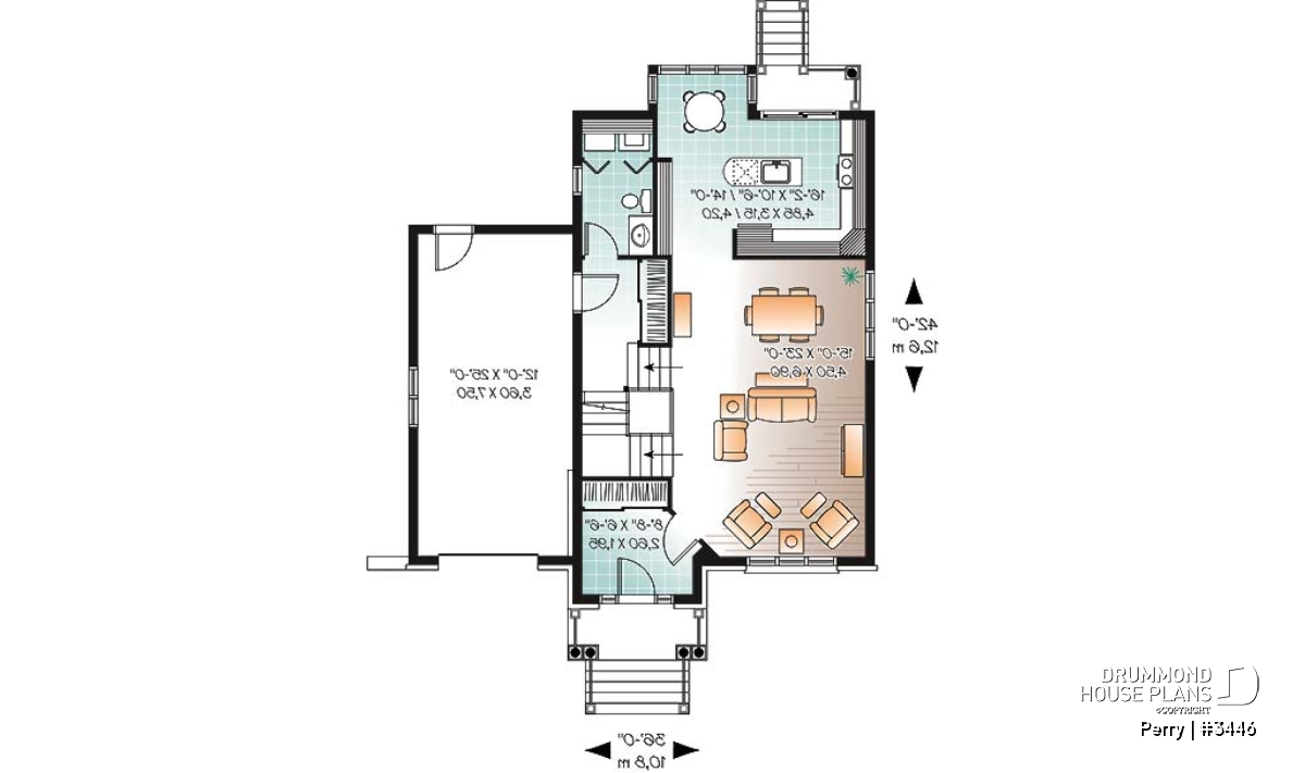 1st level - 3 bedroom manor style house plan, ideal for narrow lot , garage and great master suite - Perry