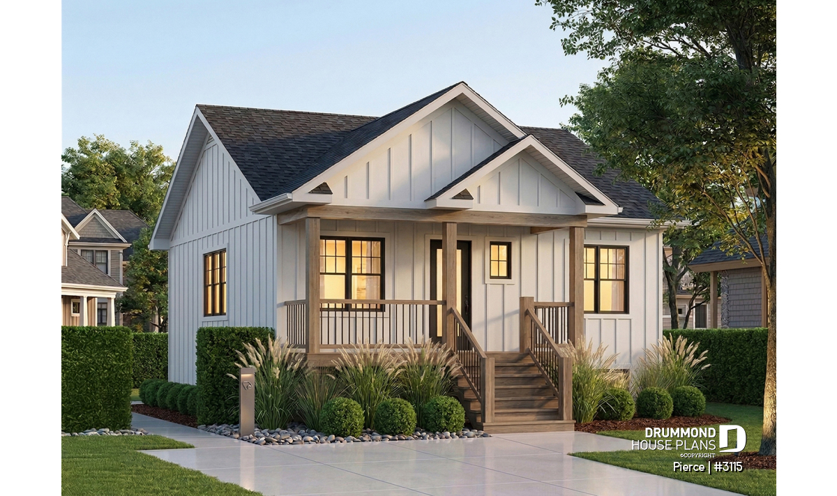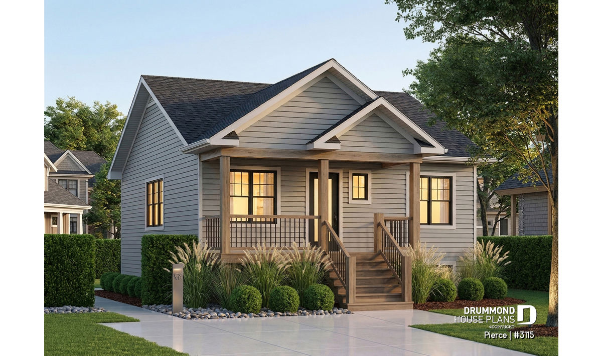 Economical 2 bedroom bungalow with kitchen island and veranda, ideal first-home buyer house plan