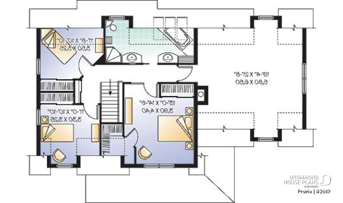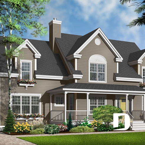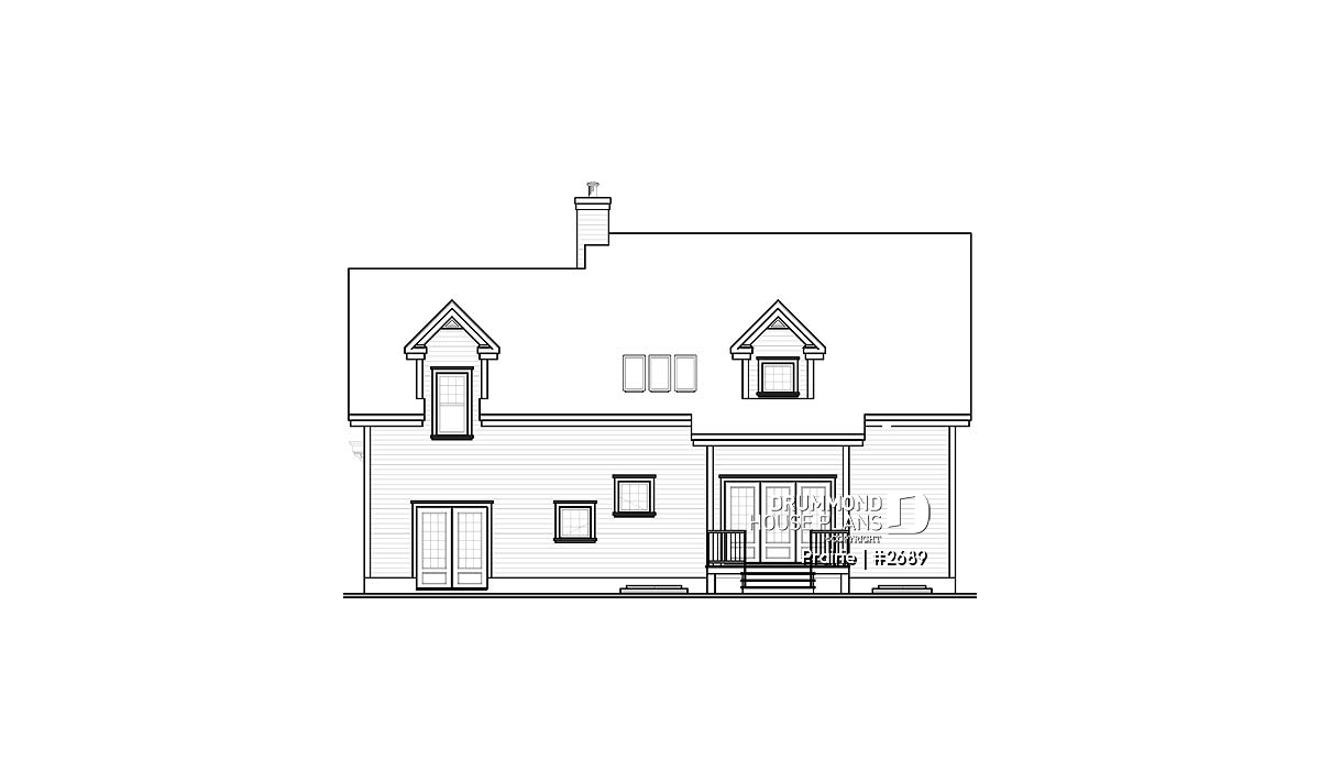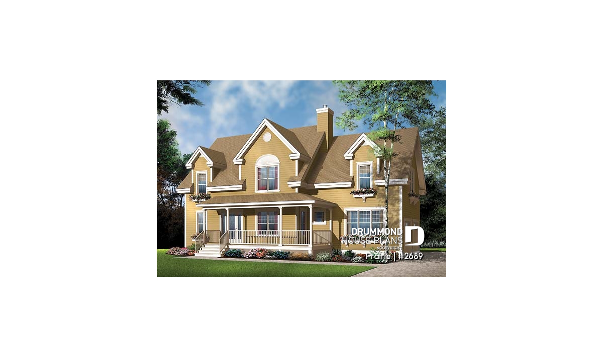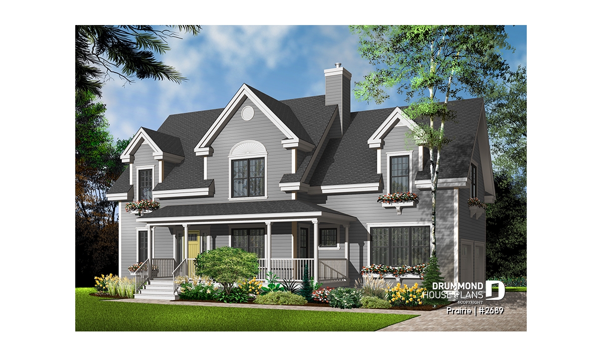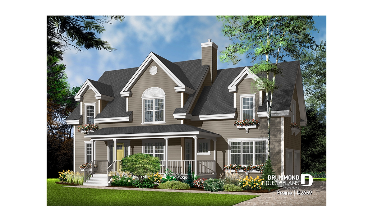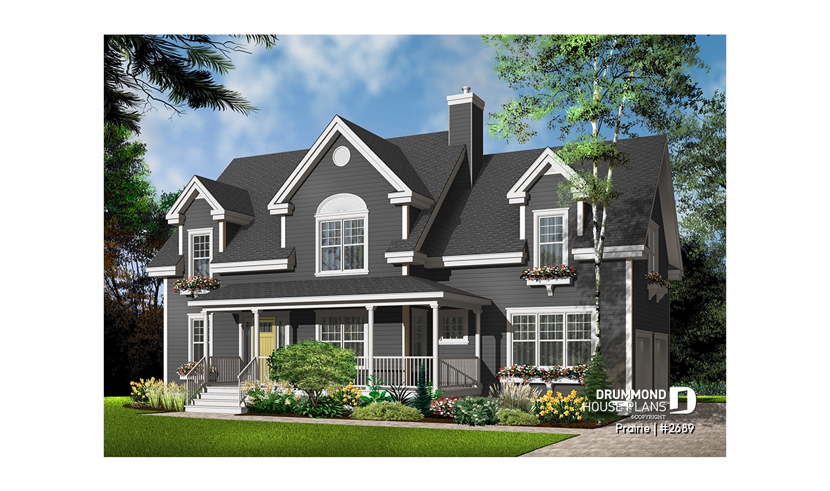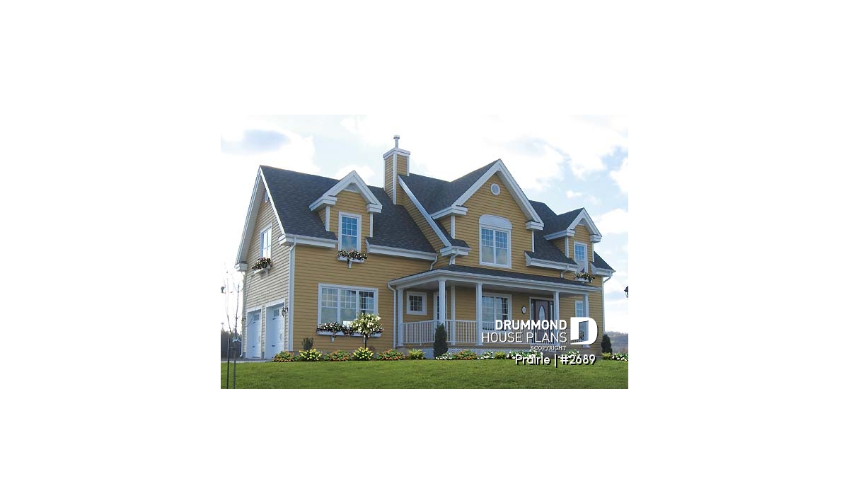 Derived from the very popular model 2590, which can be viewed on our site at www.drummonddesigns.com, this model is even more practical with the addition of a double garage above which a remarquable bonus space will surely fill your needs in terms of space, whether it is for the addition of a vast family room, space for a billiard table or even for a home theatre; with this space, there’s no problem!
