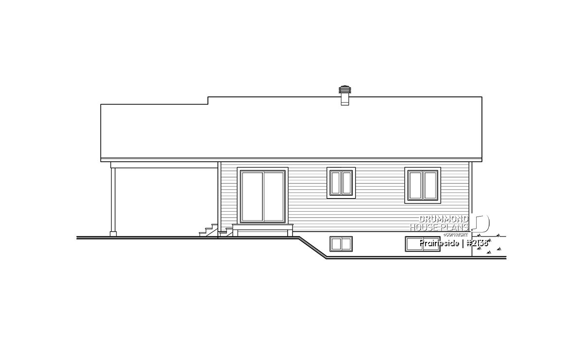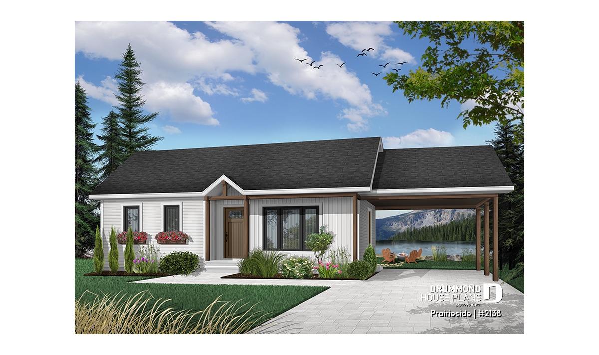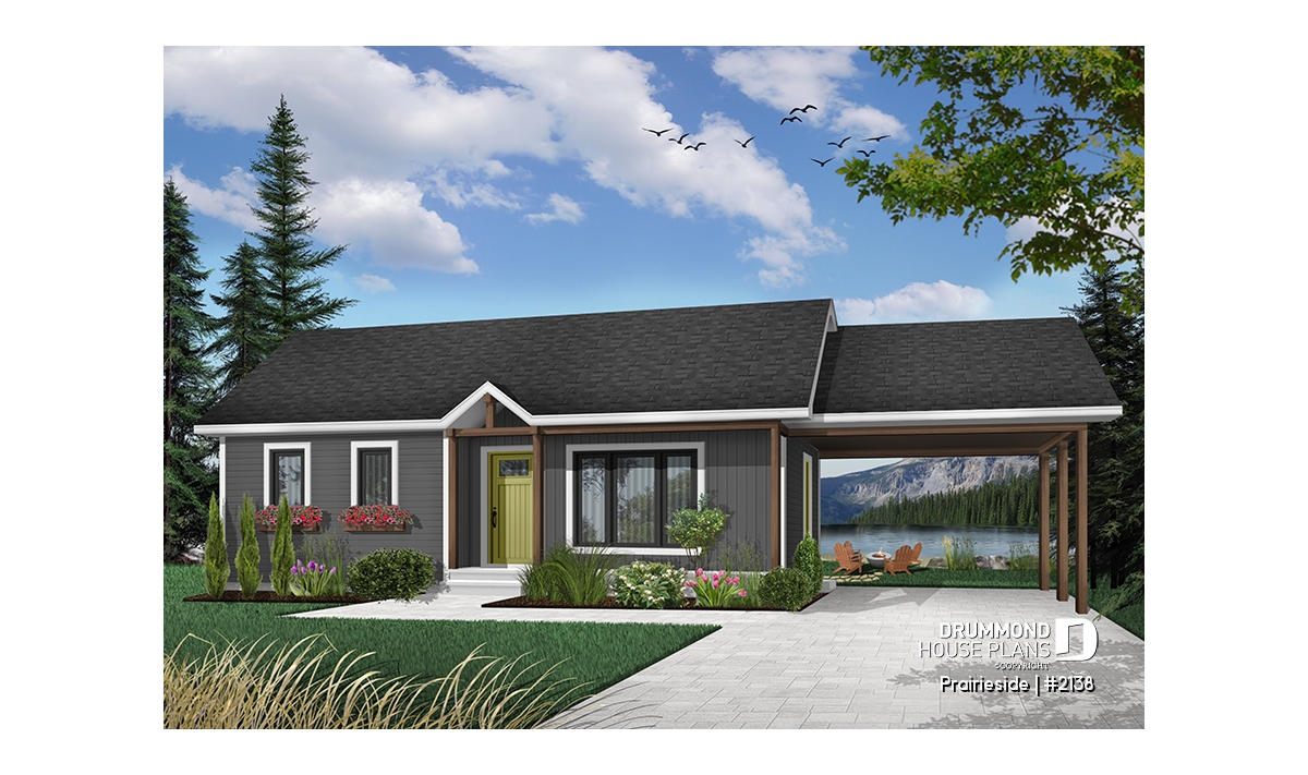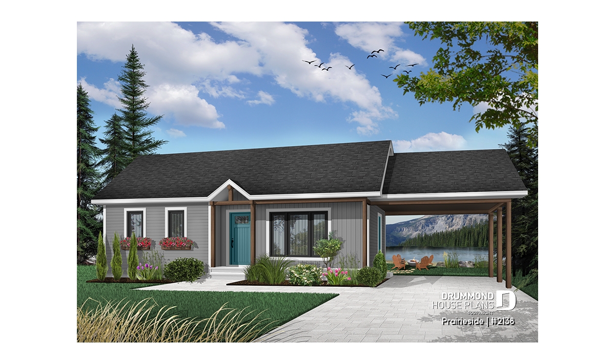 Ranchers have a long history of popularity due to their economical use of space and materials. This rancher delivers on the promise of both. A covered porch graces the front of this 2 bedroom, 947 sq. ft. home. Bedrooms are located in their own wing divided by a shared bathroom, complete with laundry. The dining room and kitchen are open to each other to create the feeling of greater space. A forward-facing living room is situated to easily receive guests and to provide easy basement access for the kids to enjoy their own space. An attached carport provides shelter from the seasons.