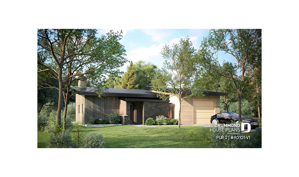 For a minimalist and evolving lifestyle: Created for an orientation to the north, tiny house plan PUR 2 (# 90101-V1) has everything to meet your minimalist needs in addition to being able to evolve over time! The base of this house corresponds to tiny home plan PUR (# 90101), which contains a kitchen and dining room, a living room, a bedroom, a bathroom, a mechanical room and even a greenhouse. This cozy home is on a budget while including all the essentials of a home. The basic plan allows you to evolve towards the PUR 2 model (# 90101-V1) which consists of adding a garage on the left side, while retaining the greenhouse.