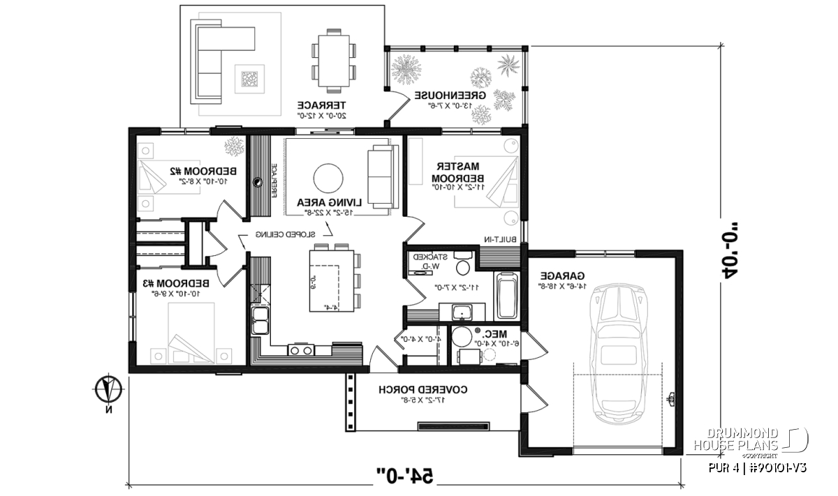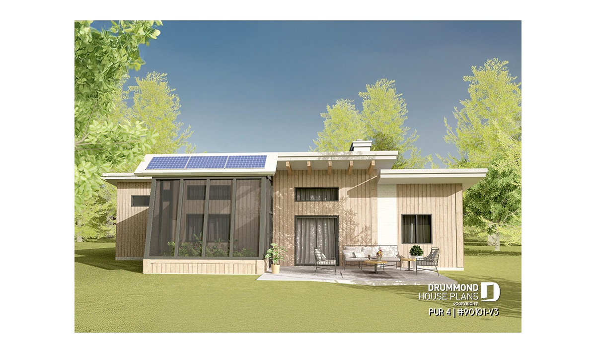 Created for an orientation to the north, the PUR 4 tiny home plan (# 90101-V3) has everything to meet your minimalist needs! The base of this house corresponds to the mini house PUR 3 (# 90101-V2) which contains a kitchen and dining room, a living room, 3 bedrooms, a bathroom, a mechanical room and even a greenhouse. This cozy home is on a budget while including all the essentials of a home.