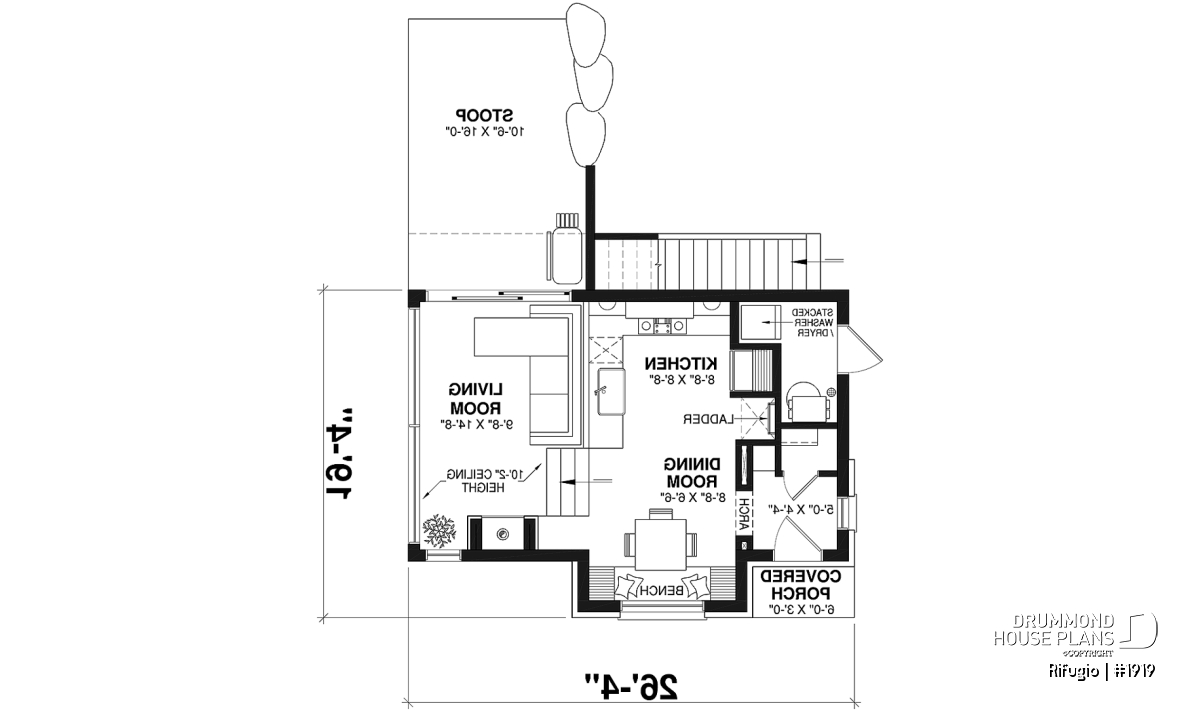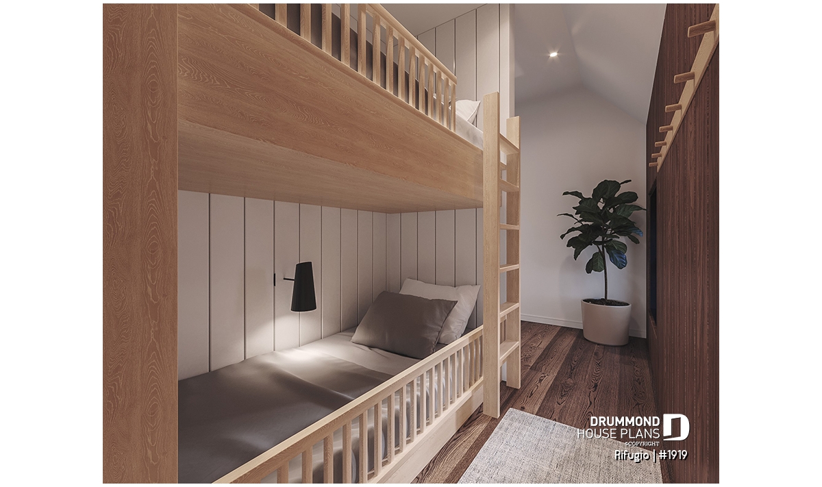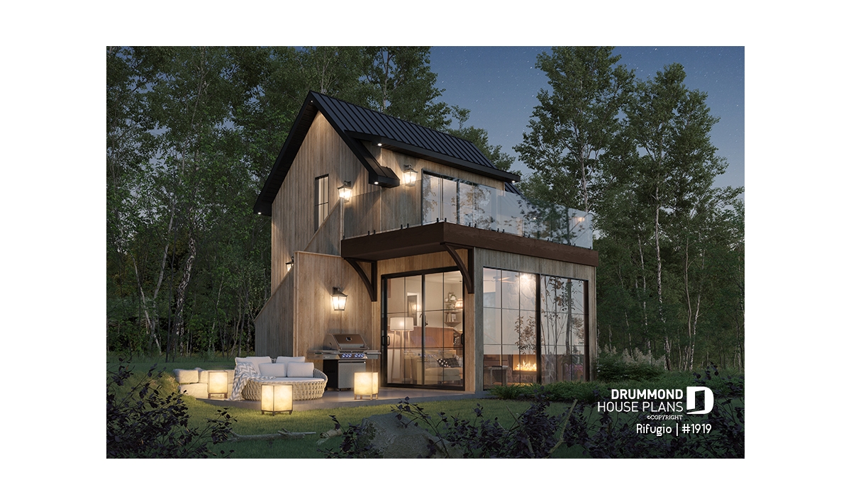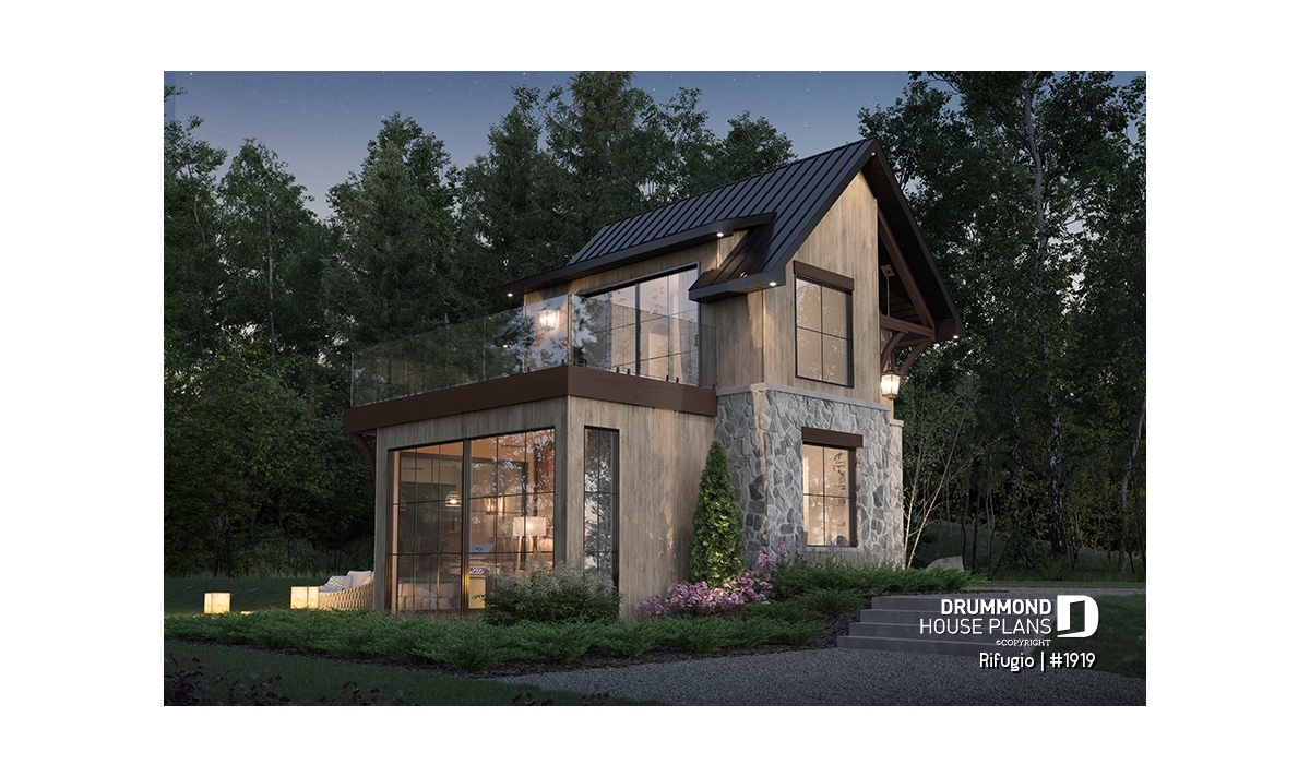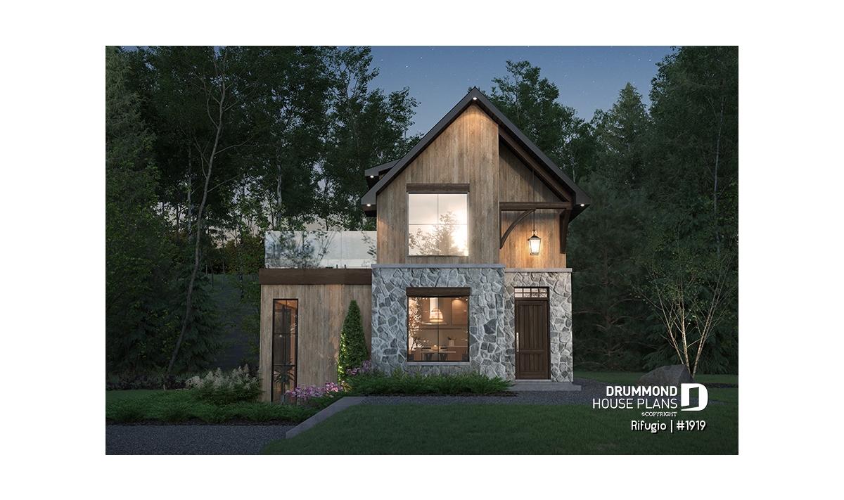 The "Rifugio" cottage plan (#1919) offers 741 sq.ft., thoughtfully laid out over 2 floors. Despite its compact size, it offers several attractions that will appeal to a small family or two couples on vacation. It was also designed with a thought of possible rental. Its stone and wood exterior look blends perfectly with a forest decor and immediately offers the prospect of a restful, zen and hassle-free stay!