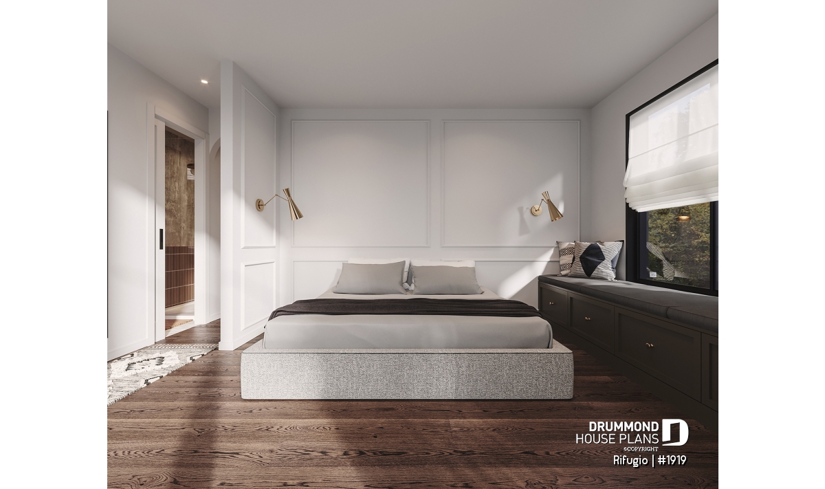 Master bedroom upstairs offers a large reading bench and access to the large 19'4'' x 10' terrace.