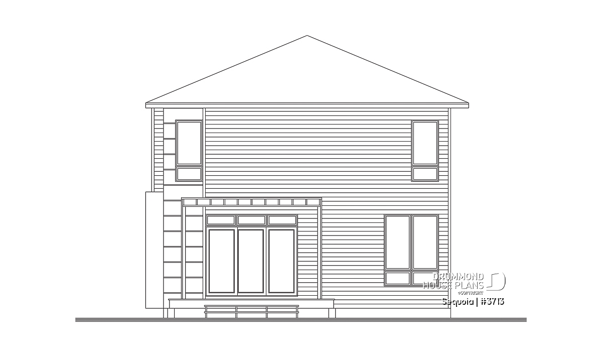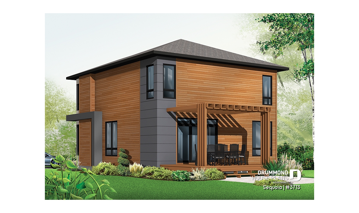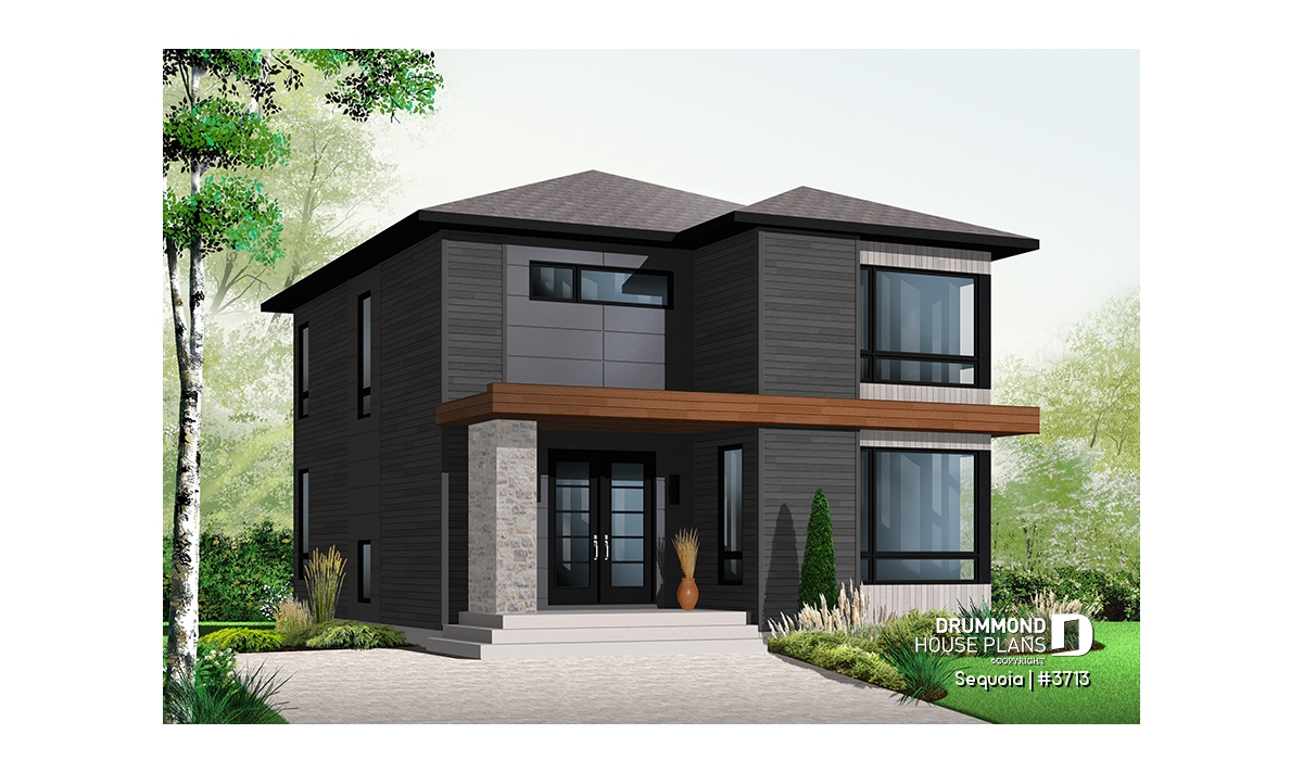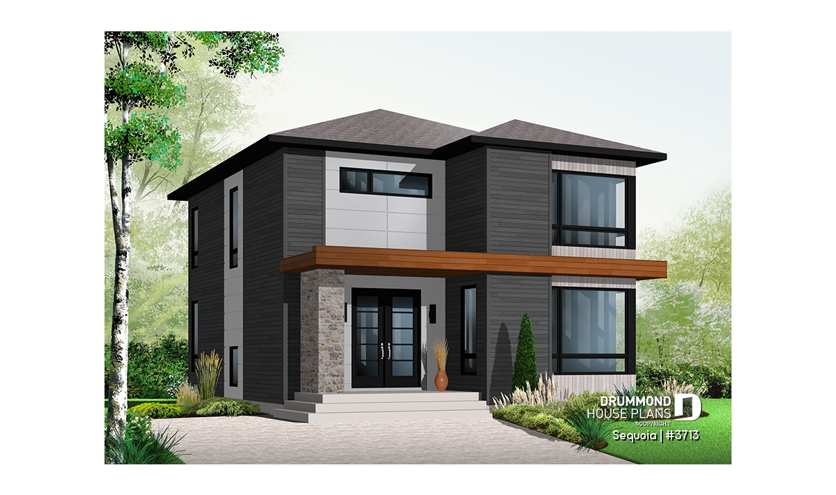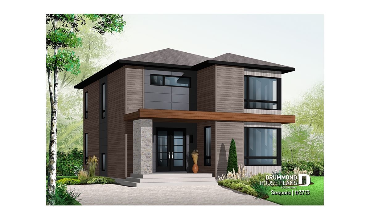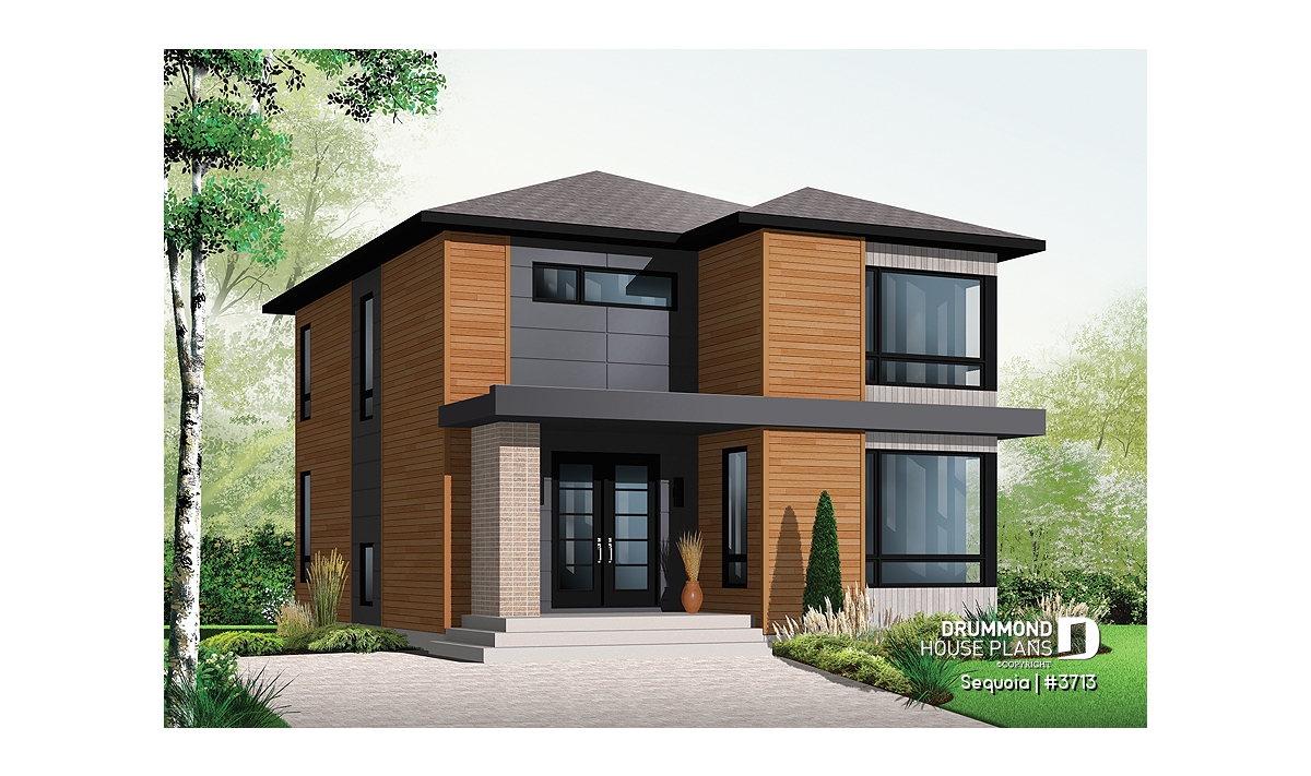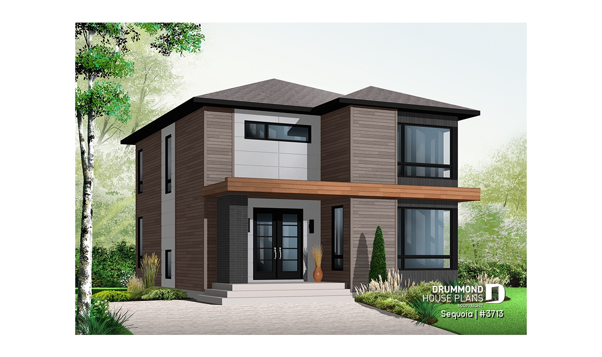 This stately modern design features strong geometric lines subtly enhanced by a blend of wood, brick and fiber cement panels.