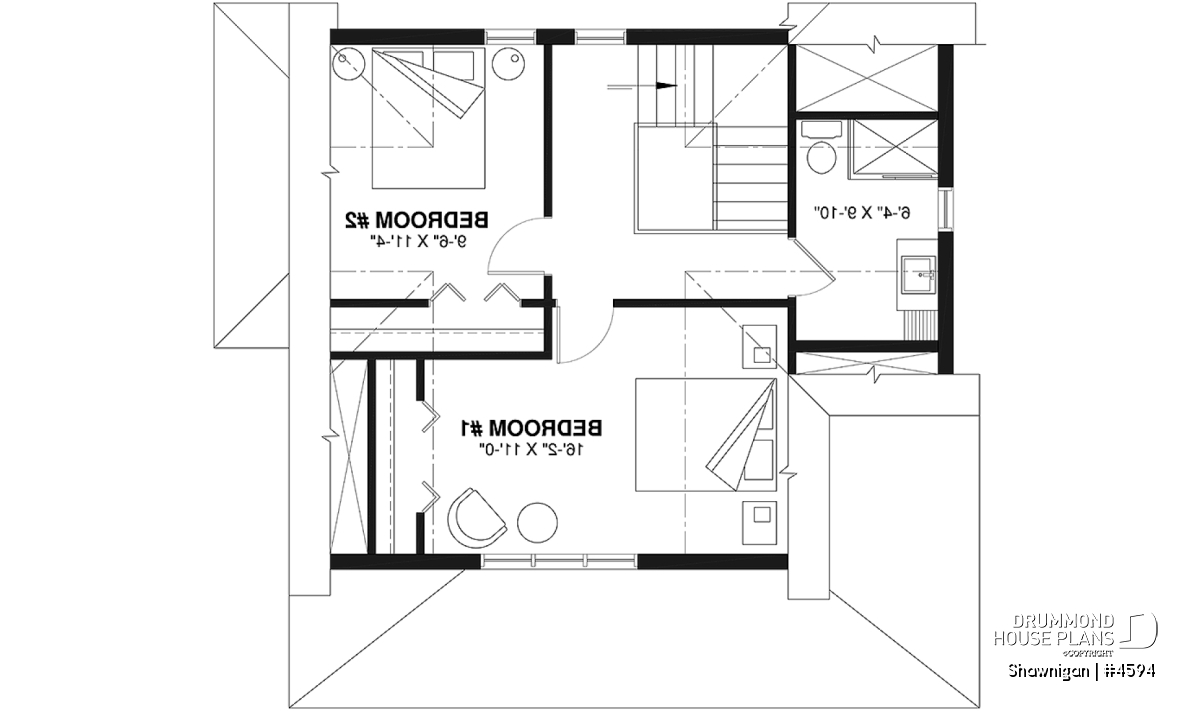 Upstairs, sloped ceilings add interest to every room. A full bath serves the two bedrooms.