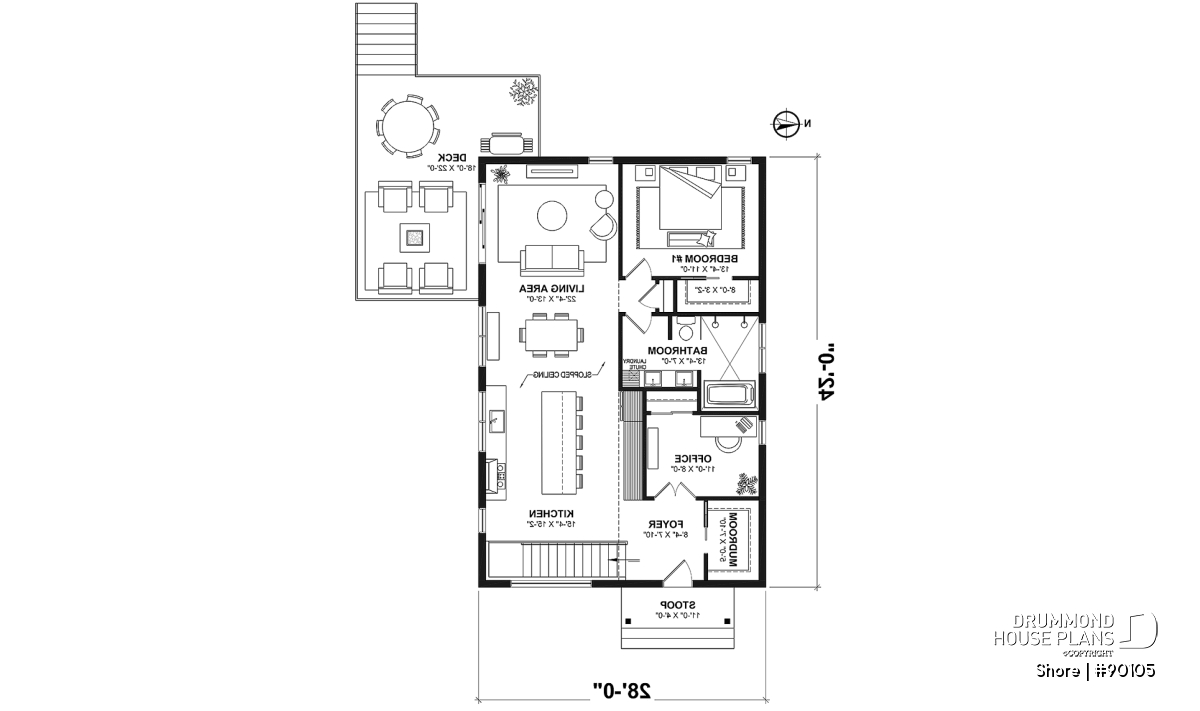 House plan SHORE (# 90105) was designed to have no corridors and therefore no loss of space! Each square foot of SHORE has been optimized and assigned a function.