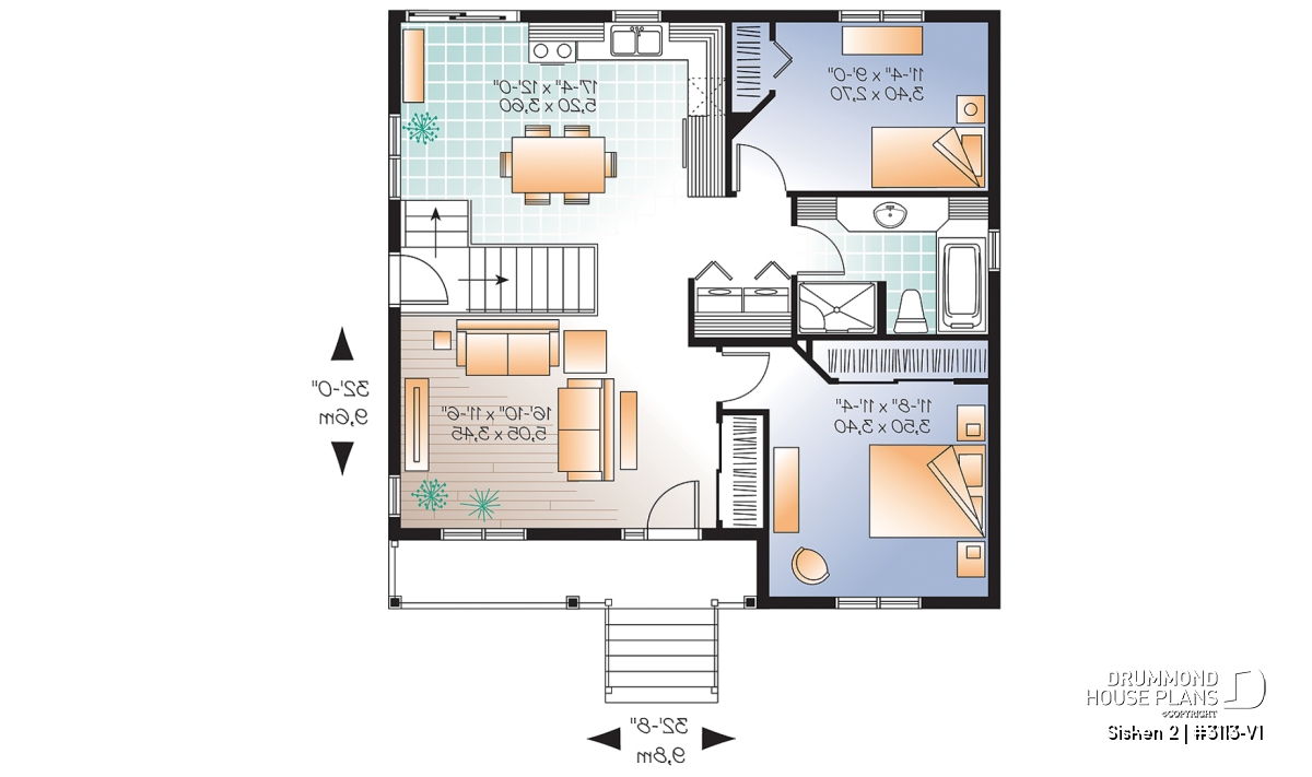 2 bedroom, country style raised bungalow house plan with full basement, and laundry on main floor