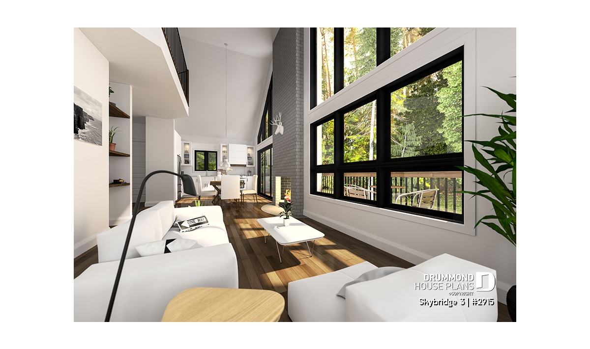 Designed across **three thoughtfully planned levels**, the SKYRIDGE maximizes interior volume, natural light, and views. The main floor immediately impresses with a **dramatic cathedral ceiling**, a must-have feature in chalet architecture that enhances openness and creates a striking visual connection with the surrounding landscape. Large windows frame the scenery, while the open-concept **living room, dining area, and kitchen** encourage togetherness and effortless entertaining. A **centrally positioned fireplace** anchors the space, delivering warmth and ambiance year-round.