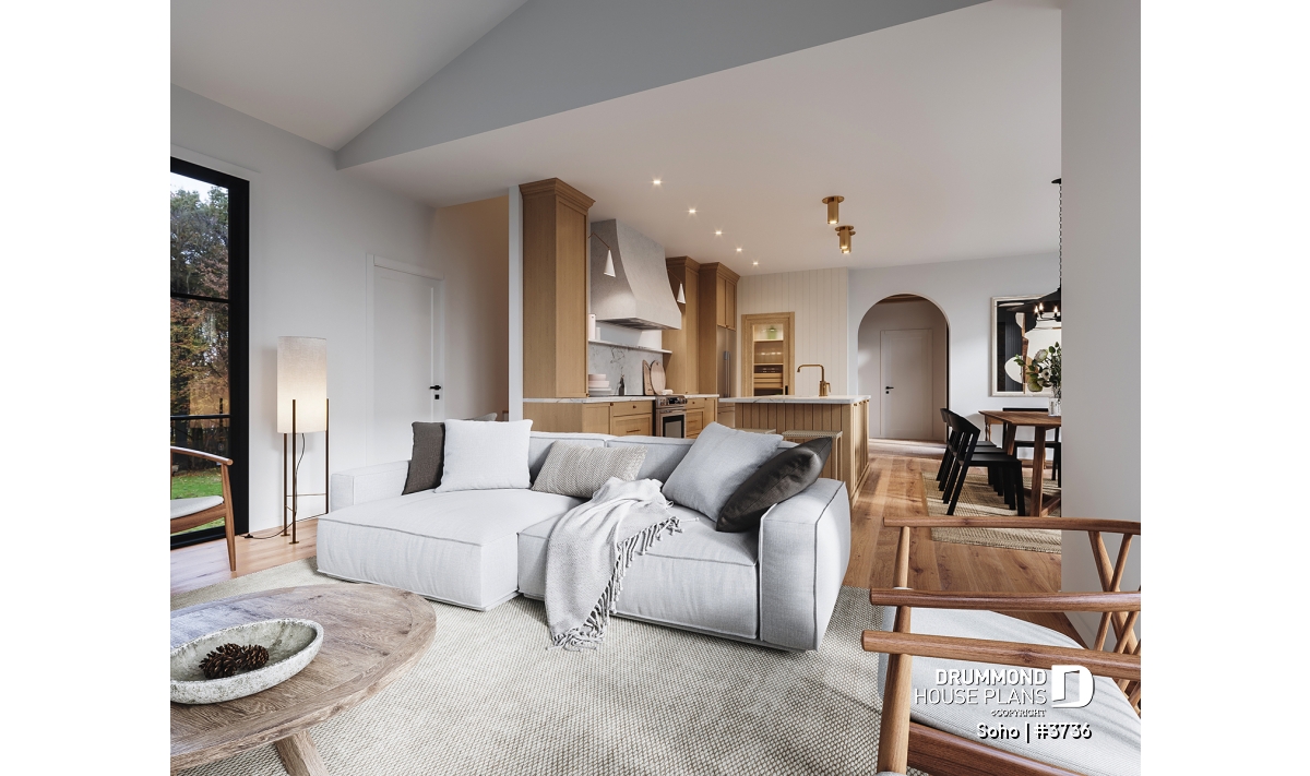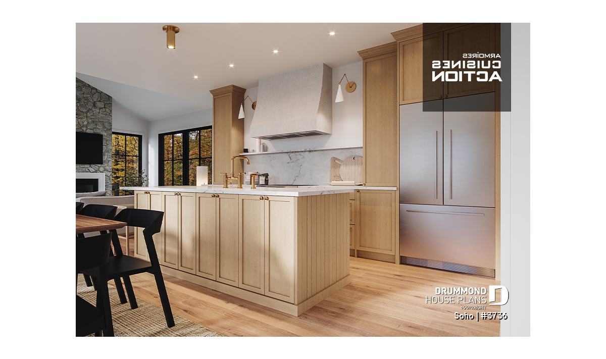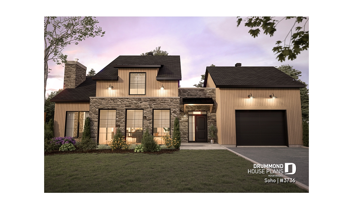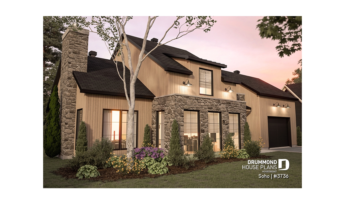 Transitional-inspired house, offering noble materials such as stone on the facade and on the fireplace.
