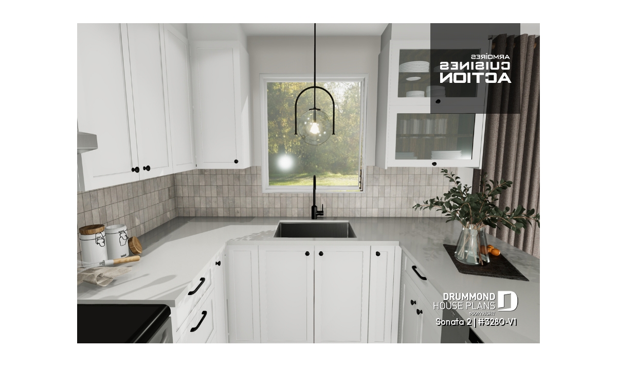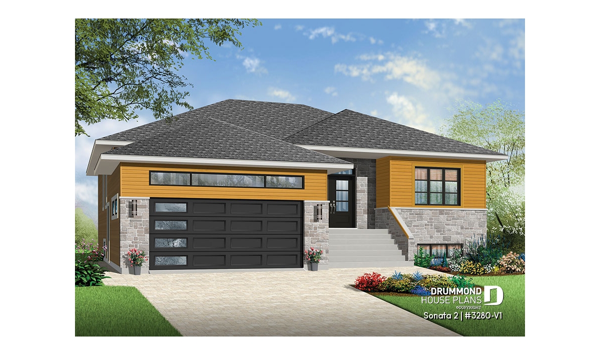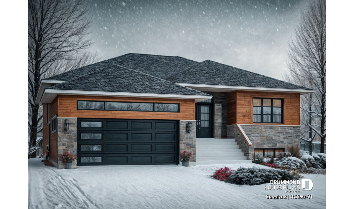 Part of the design collection inspired by model 3280, the modern yet elegant lines begin with its hip roof and lead down to the exterior walls, finished in pale colored brick that harmonizes well with the horizontal wood siding.