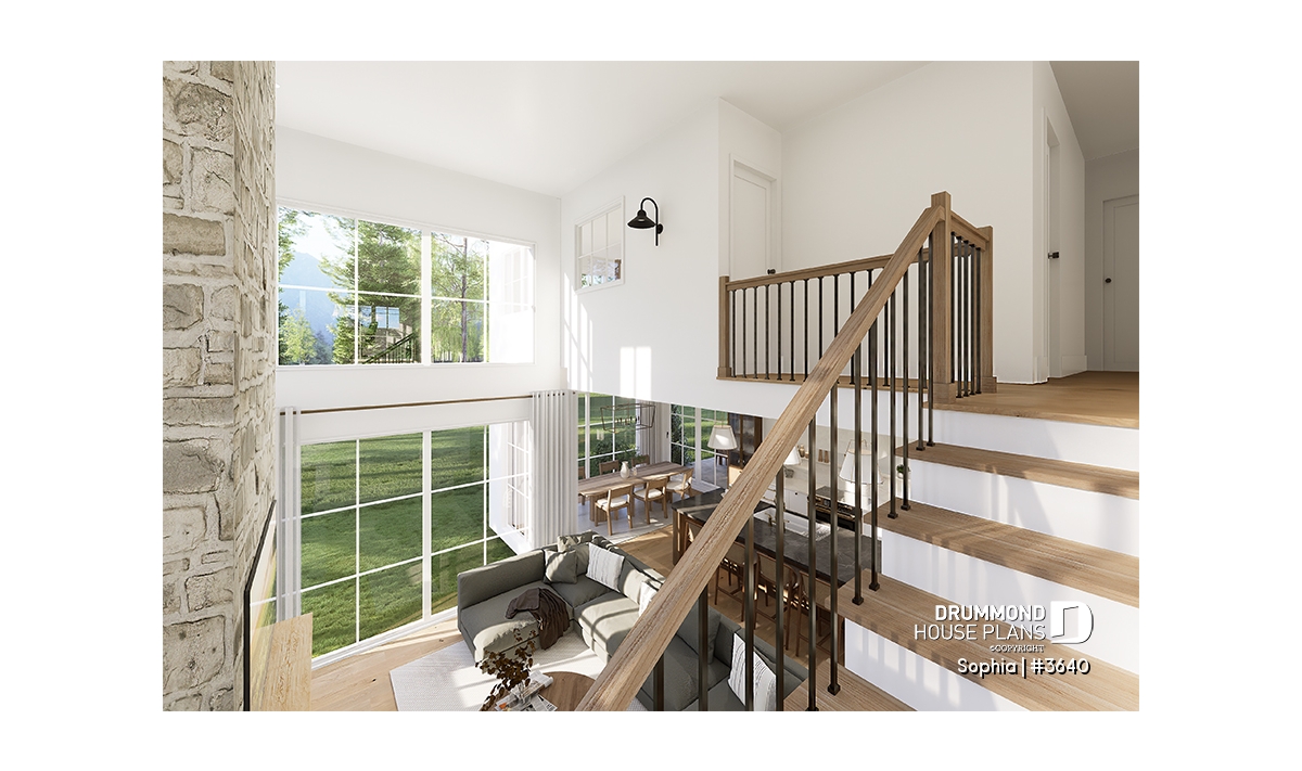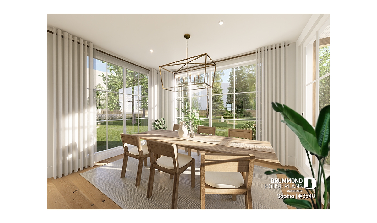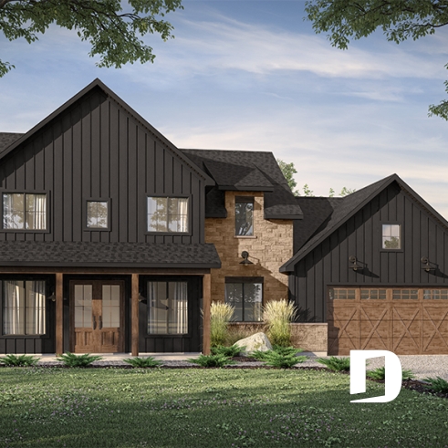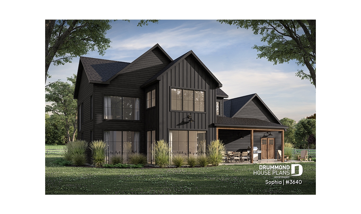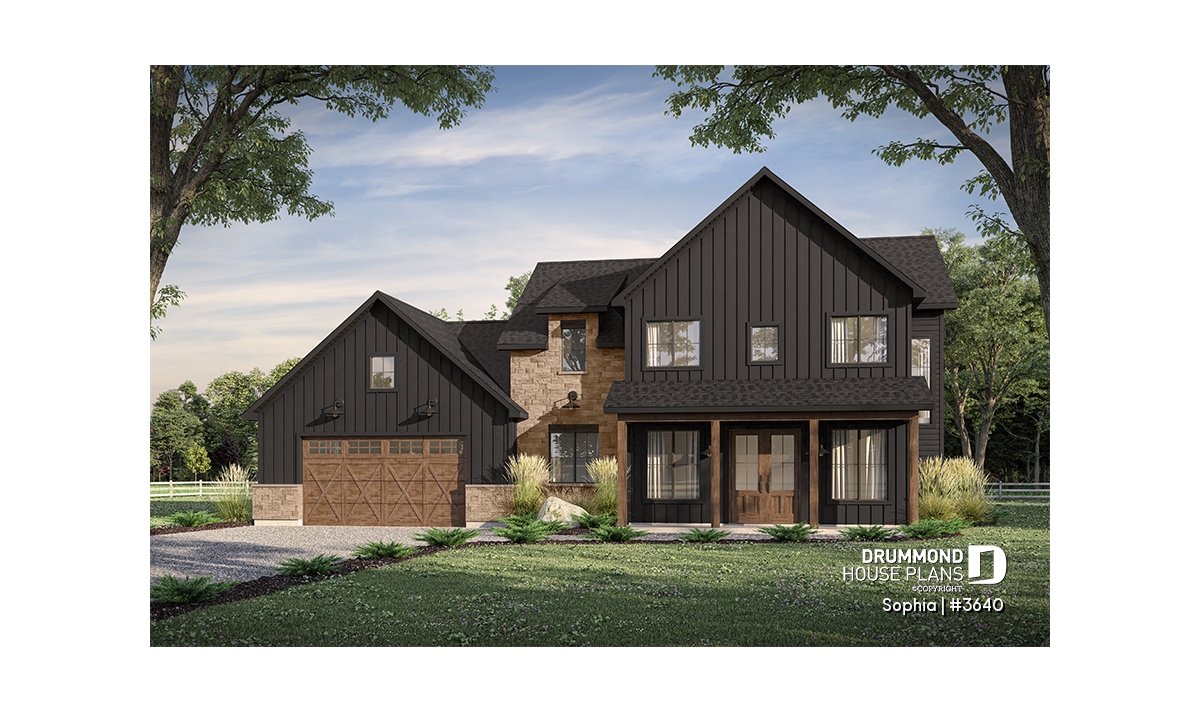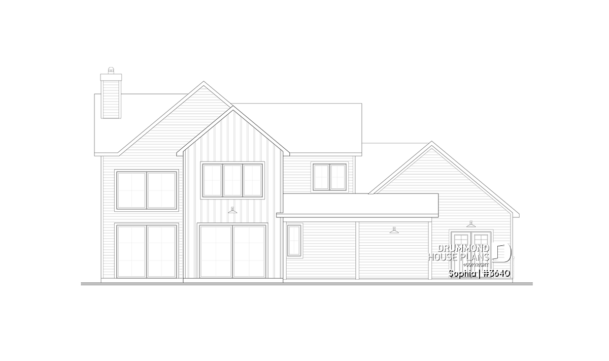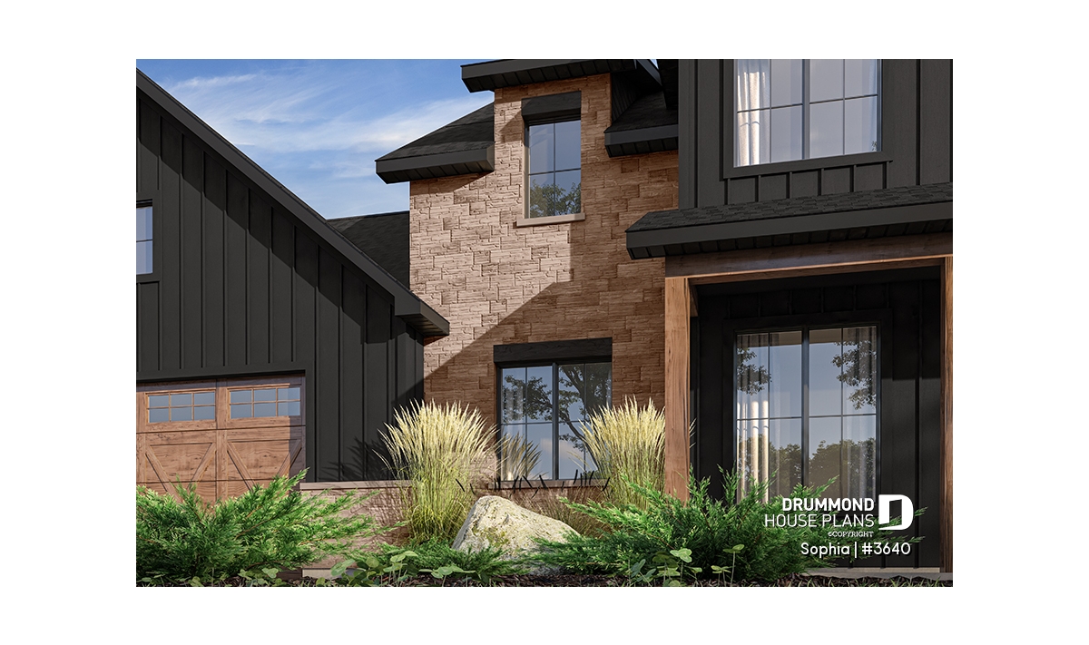 The SOPHIA home (plan #3640) offers 2,174 sq. ft. of living space, spread over two floors. The 23' x 25'8'' double garage is large enough to add a gardening area. The rear terrace offers a covered area of 22'-4 x 12'-4'' and an "uncovered" portion of 12'-2'' x 12'-4''. Several floor layouts are therefore possible. The basic foundation you will receive (included in the plan) is a floating slab. If you would like another type of foundation, simply select it in the shopping cart or contact us.