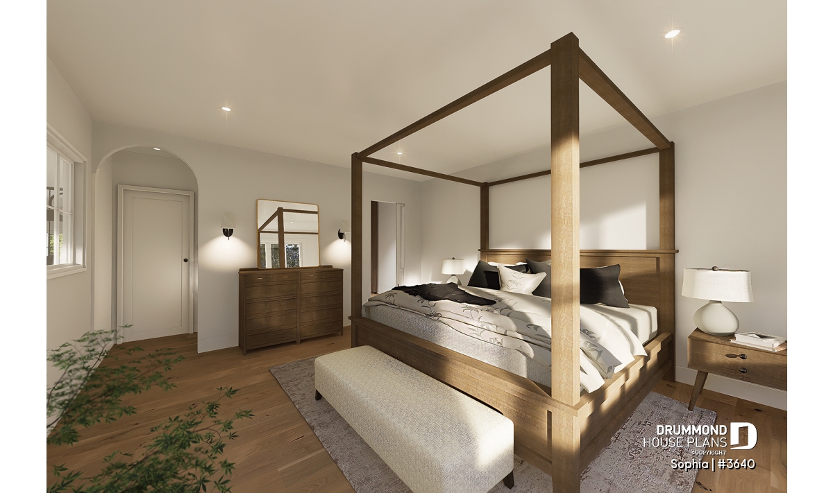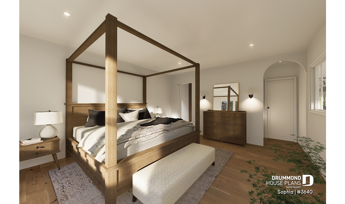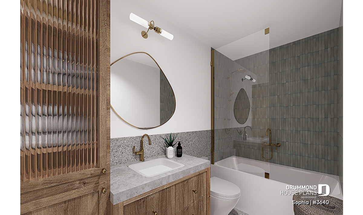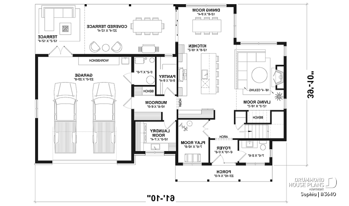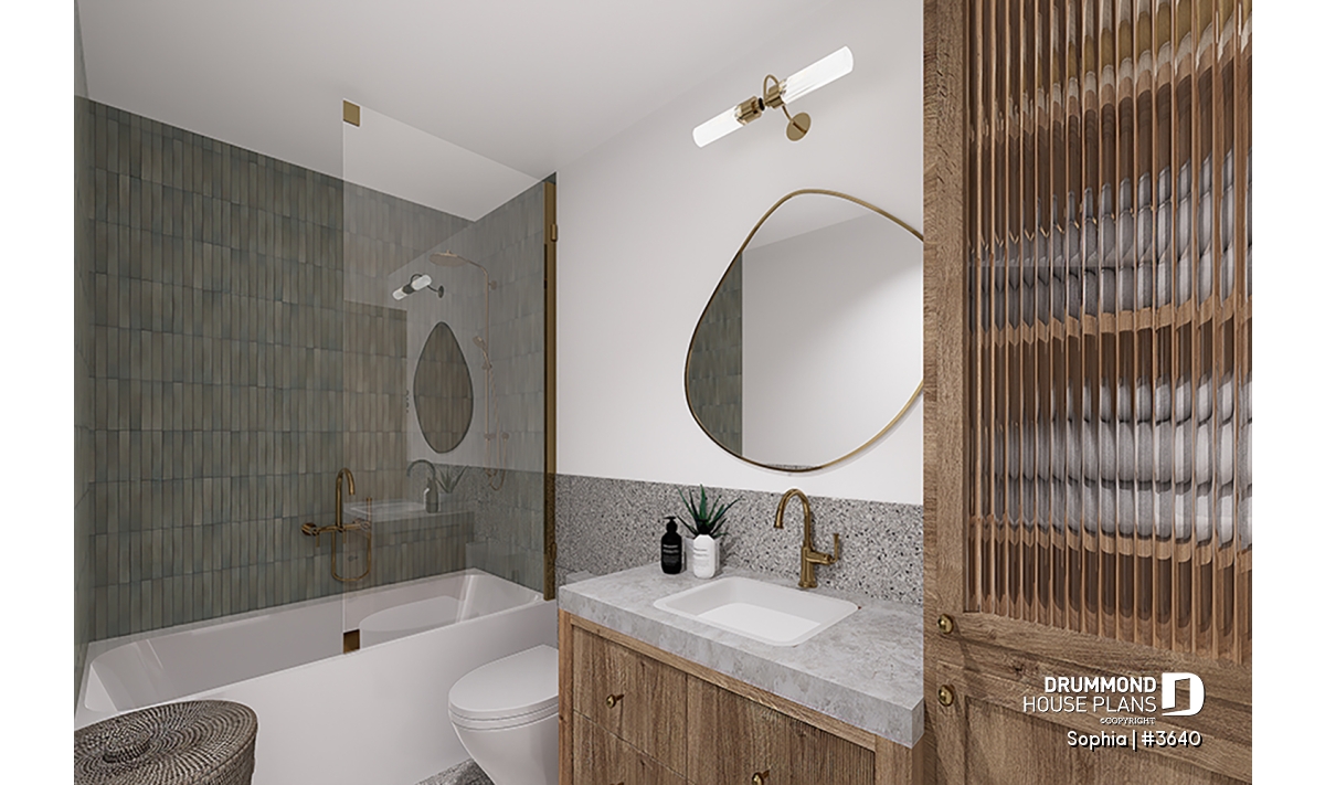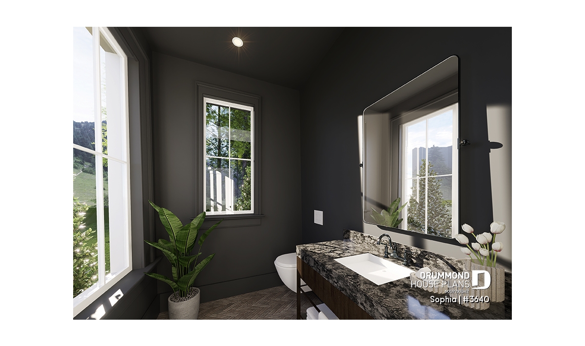 The SOPHIA home (plan #3640) offers 2,174 sq. ft. of living space, spread over two floors. The 23' x 25'8'' double garage is large enough to add a gardening area. The rear terrace offers a covered area of 22'-4 x 12'-4'' and an "uncovered" portion of 12'-2'' x 12'-4''. Several floor layouts are therefore possible. The basic foundation you will receive (included in the plan) is a floating slab. If you would like another type of foundation, simply select it in the shopping cart or contact us.