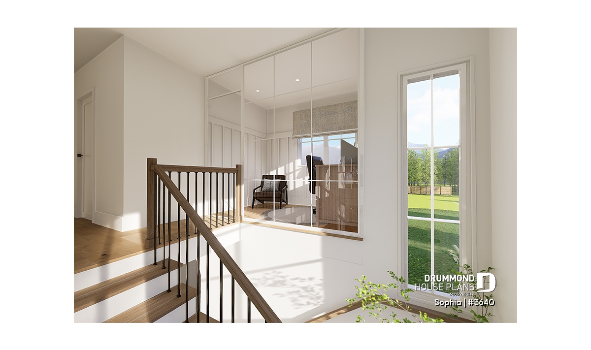 The small office at the top of the stairs has a glass panel serving as a wall, allowing a beautiful view into the living room.