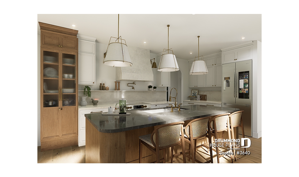 The kitchen is open to both the living room and the dining room and offers a large island and a pantry. The latter has a dimension of 5' x 9'4''.