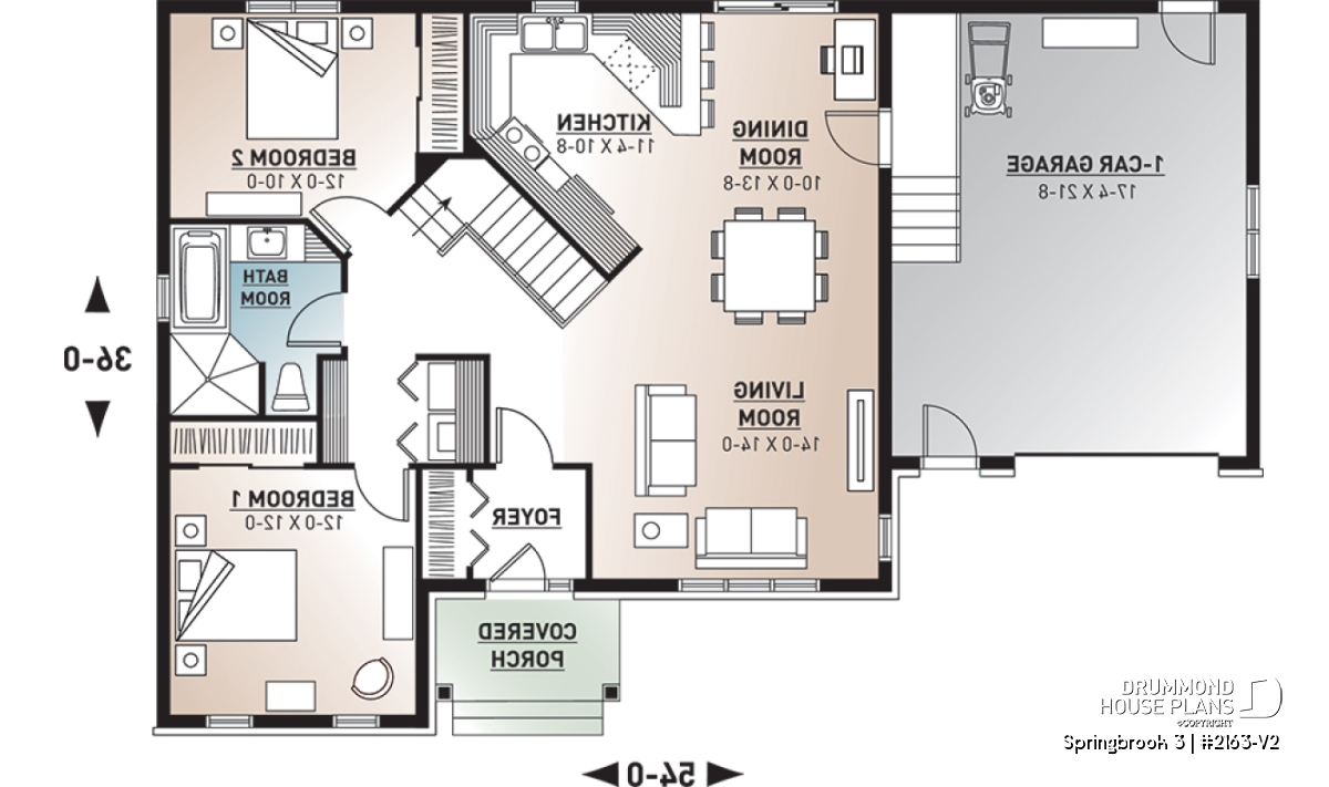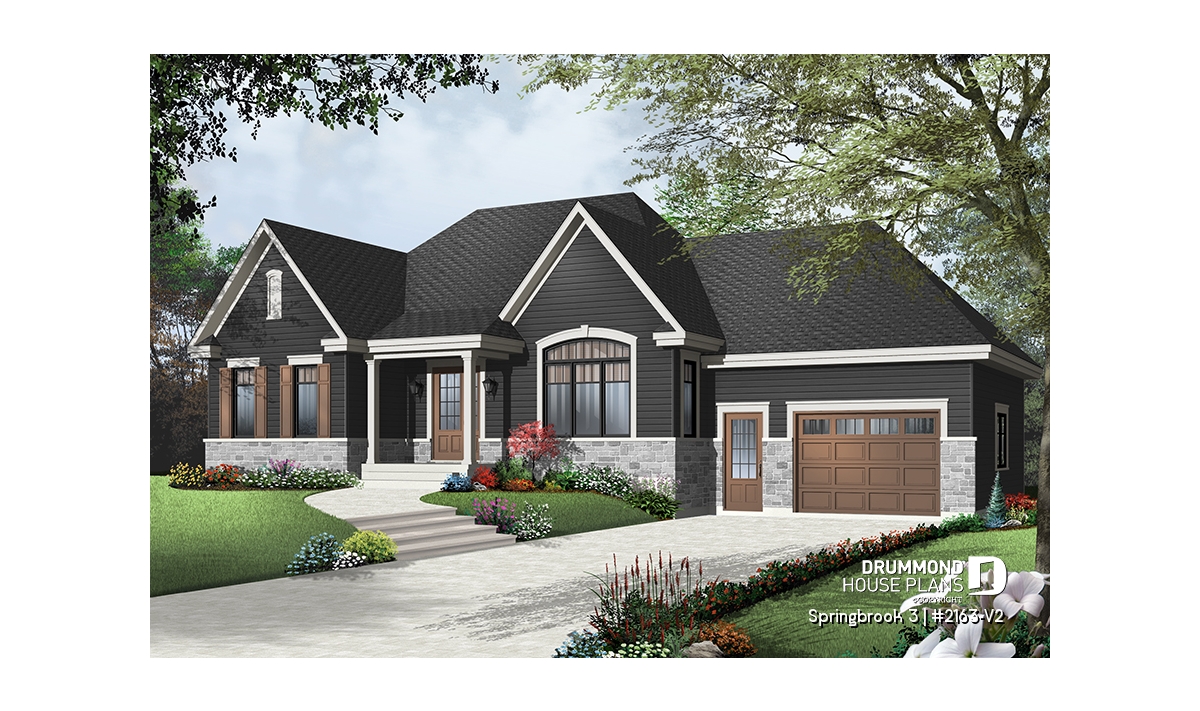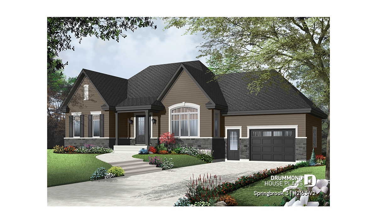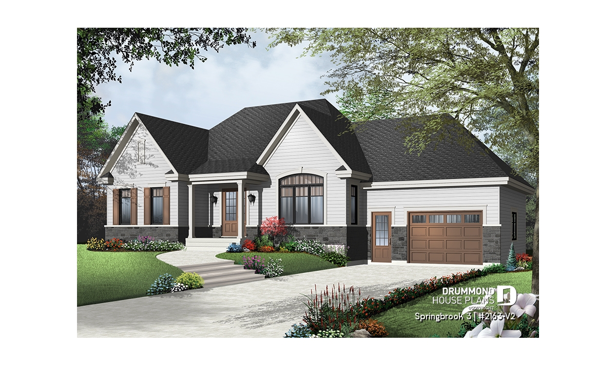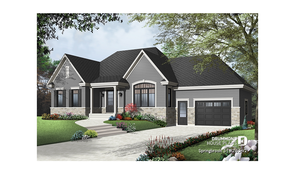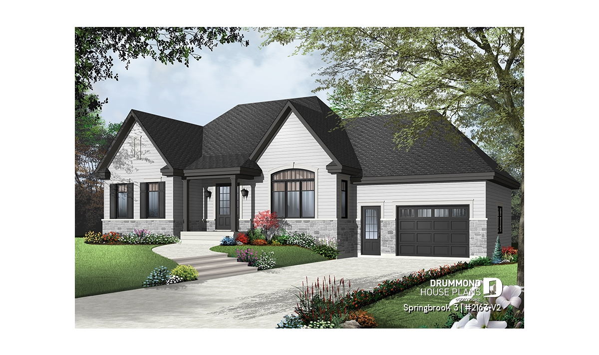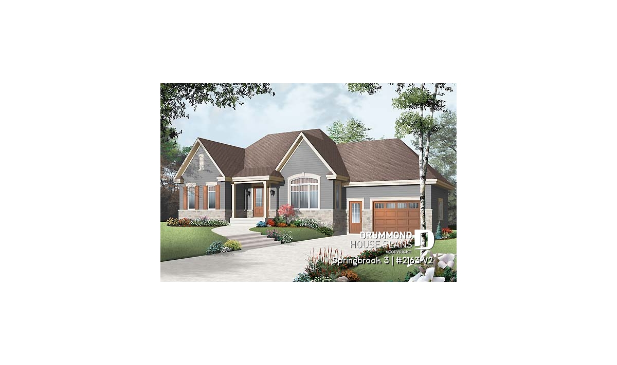 Efficient use of space allows for a feature-packed and open floor plan. The unique placement of the stairs allows for unexpected and pleasant flow to the living area. The partial cathedral ceiling in the living room further enhances the impression of generous space. This bungalow includes living room, dining room, kitchen with eating bar, computer nook, laundry area, a bathroom with soaker tub and large shower, and two bedrooms. If desired, the second bedroom could function as an office or hobby room and additional bedrooms can be added to the unfinished basement.
