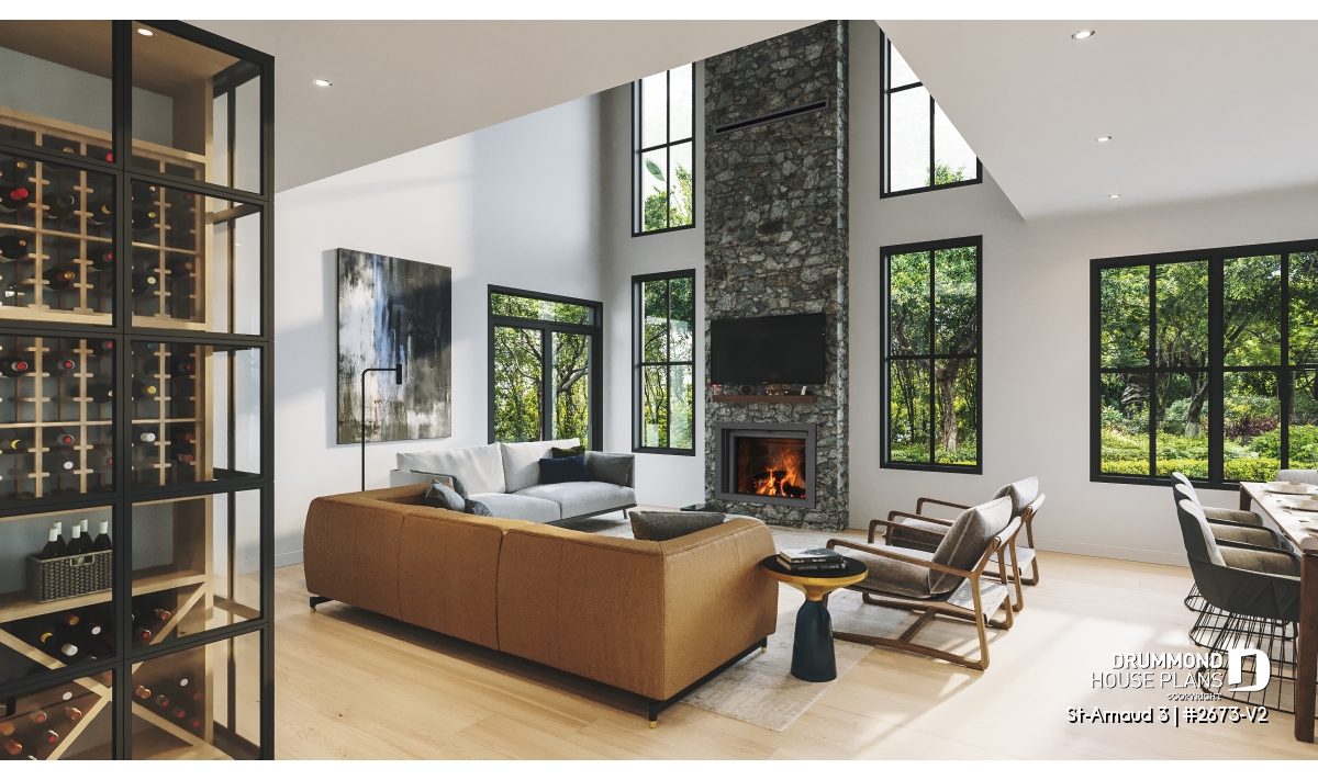The living room and family room stand out with their two-story central fireplace, bringing authentic charm and a warm ambiance. The proposed wood-burning model, the STÛV s21, is renowned for its elegant design and performance. The open mezzanine and cathedral ceiling add a dramatic effect and flood the space with natural light, creating a unique retreat where the whole family loves to gather.
