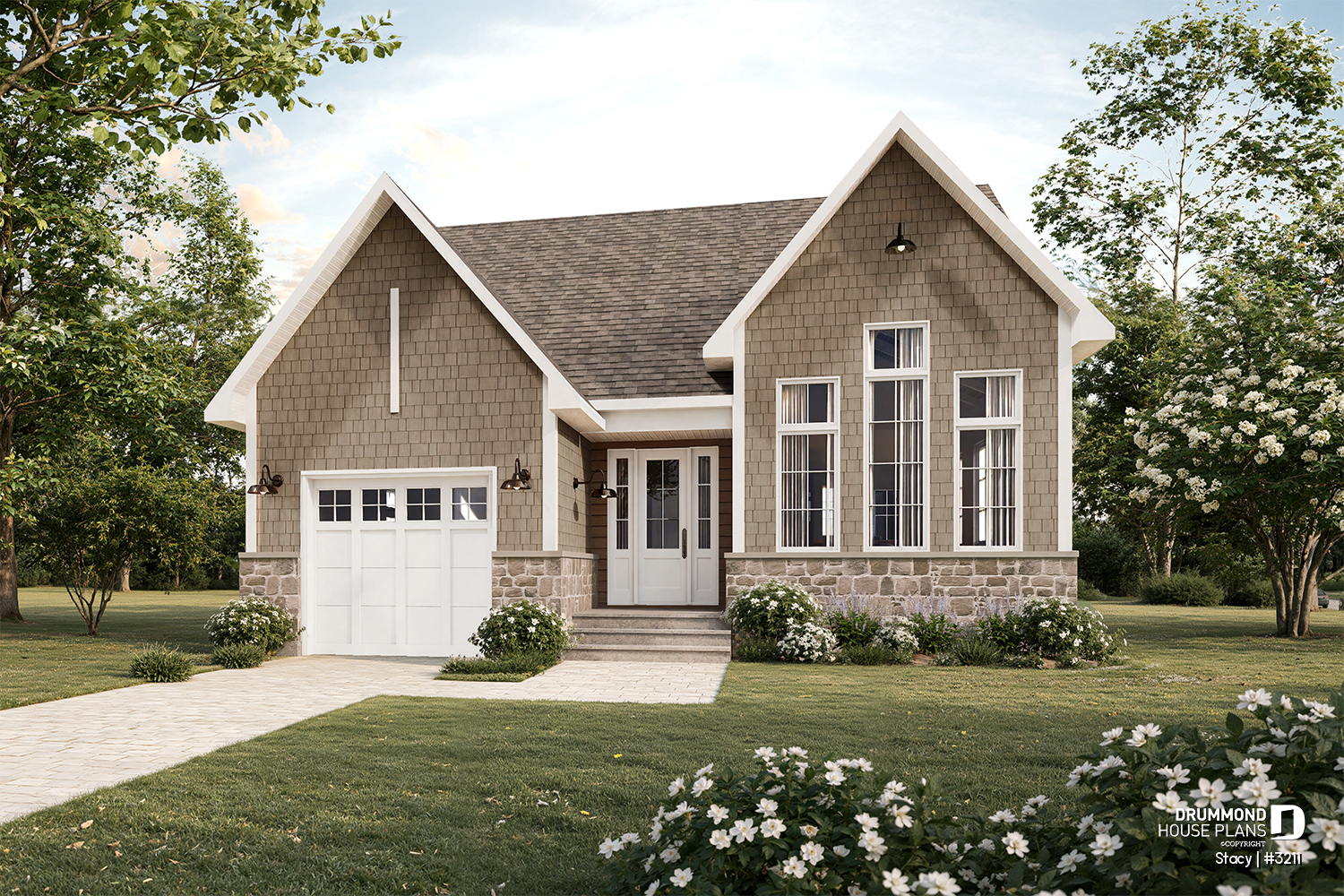 The exterior of the STACY (#3211) features a welcoming façade with cedar shingles and stone accents, creating a timeless, coastal-inspired country look. The integrated single garage adds everyday convenience while maintaining a cohesive architectural design.