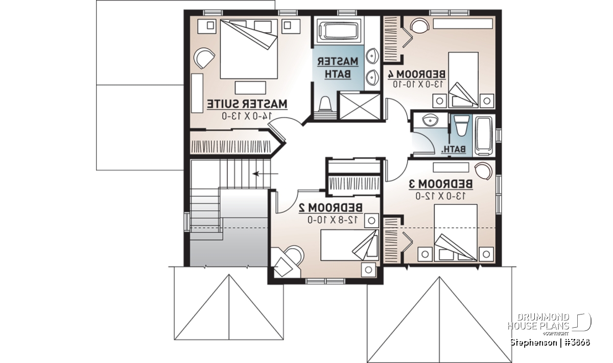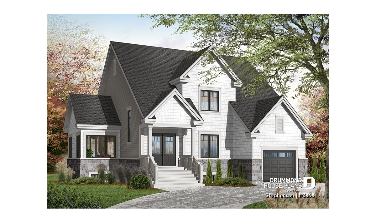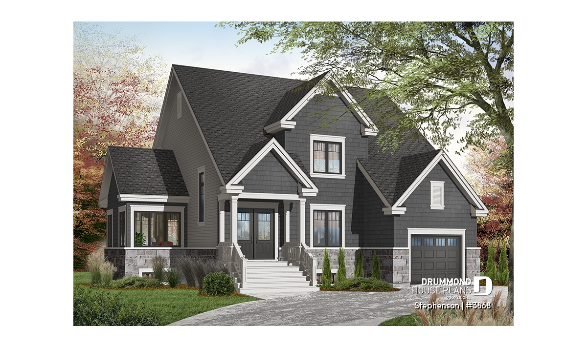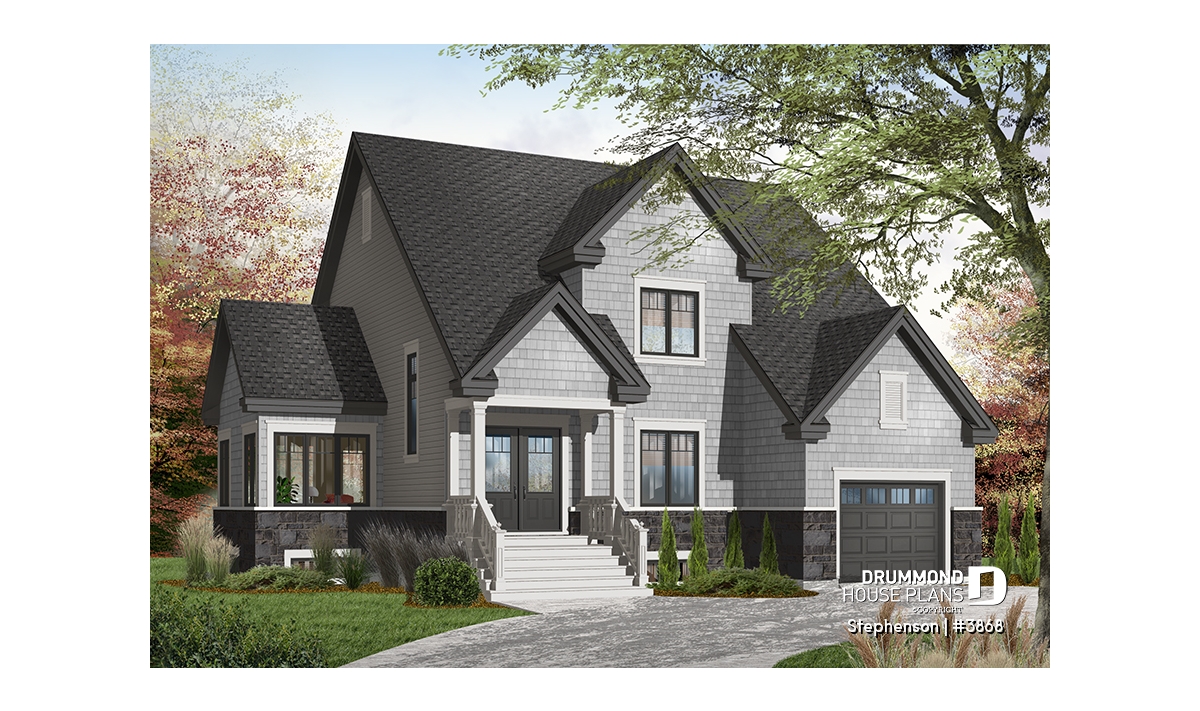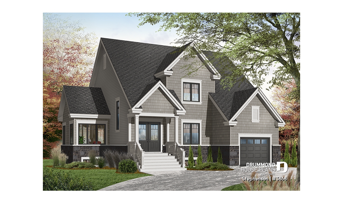 Motivated by comfort, this Drummond House Plan #3868 also named Stephenson is not only remarkable for its one of a kind exterior but also for its stylish Cape Cod style features mixed with a Craftsman touch which include brick-stone finish and imitation cedar shingle for the front elevation.