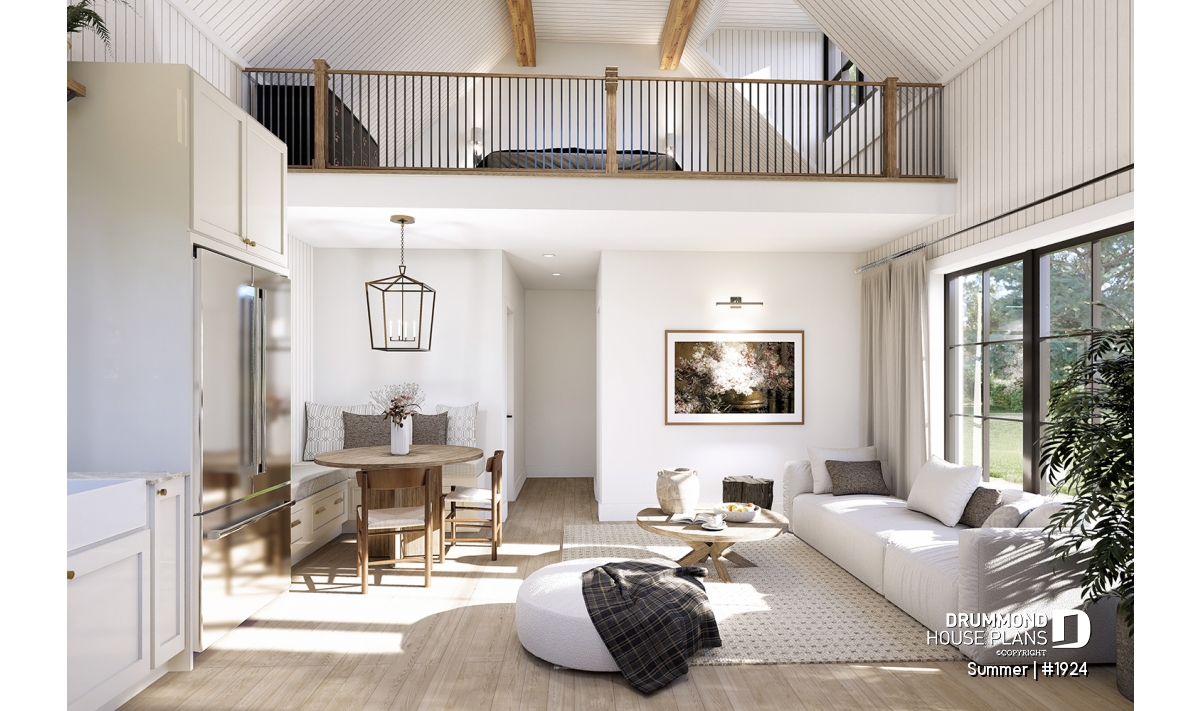 The central living area includes a simplified but stylish kitchen, as well as a bench seating breakfast area and a sitting room. The latter can accommodate different types of furniture configurations, while taking advantage of the beautiful large window on the left that allows full natural light to come in. In addition, the 17' sloped ceiling covers a good part of the living area, and is open to the mezzanine upstairs. At the back, there is a shower room and a small mechanical room with shelf storage.