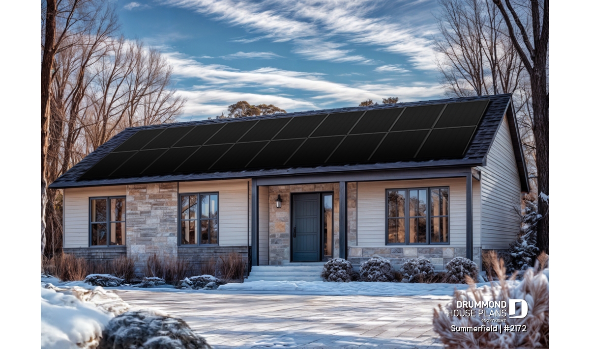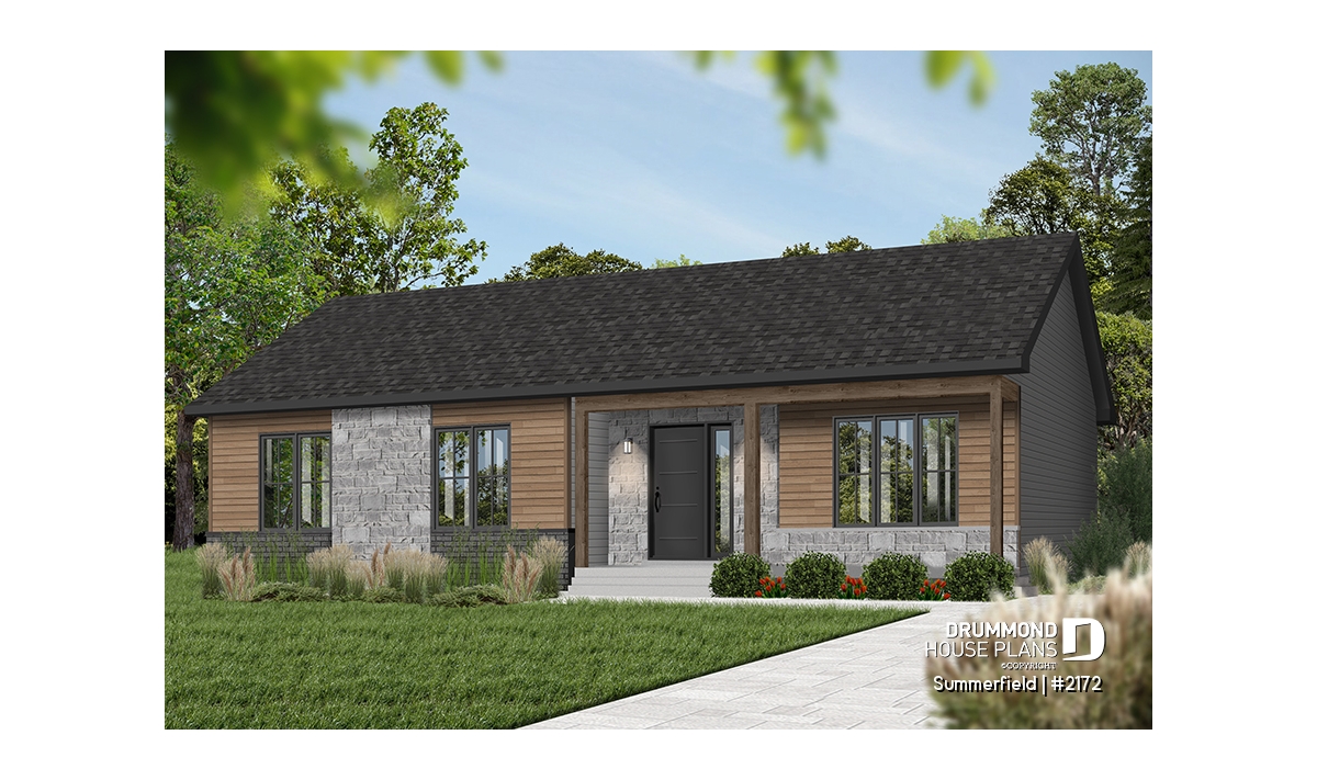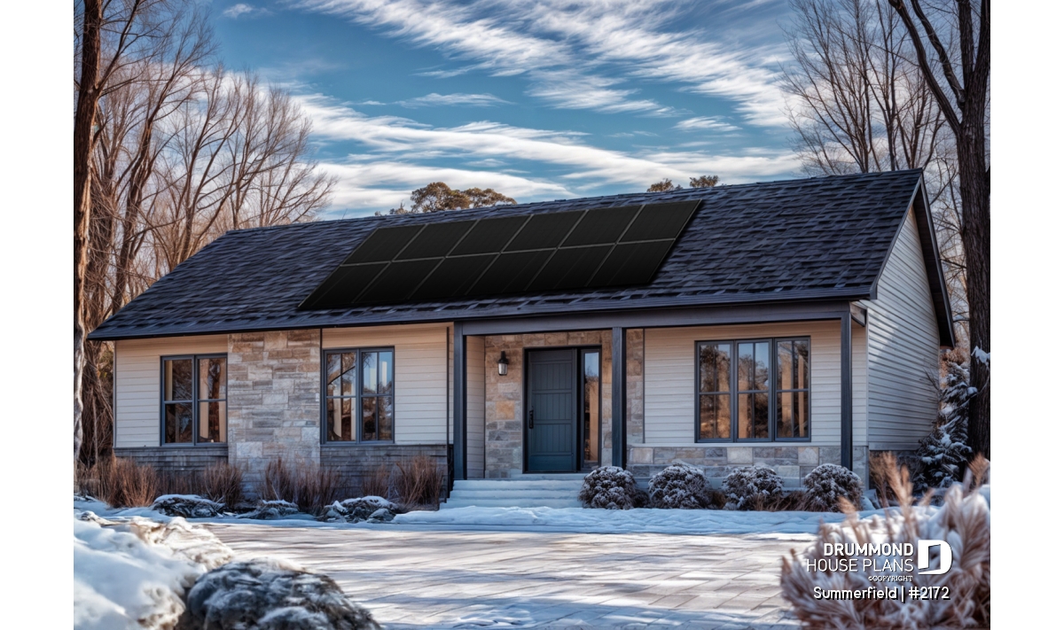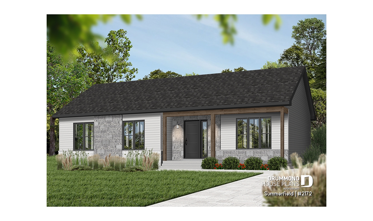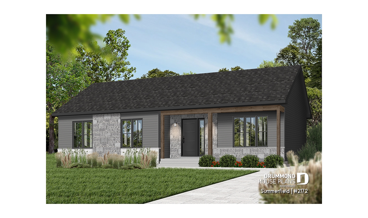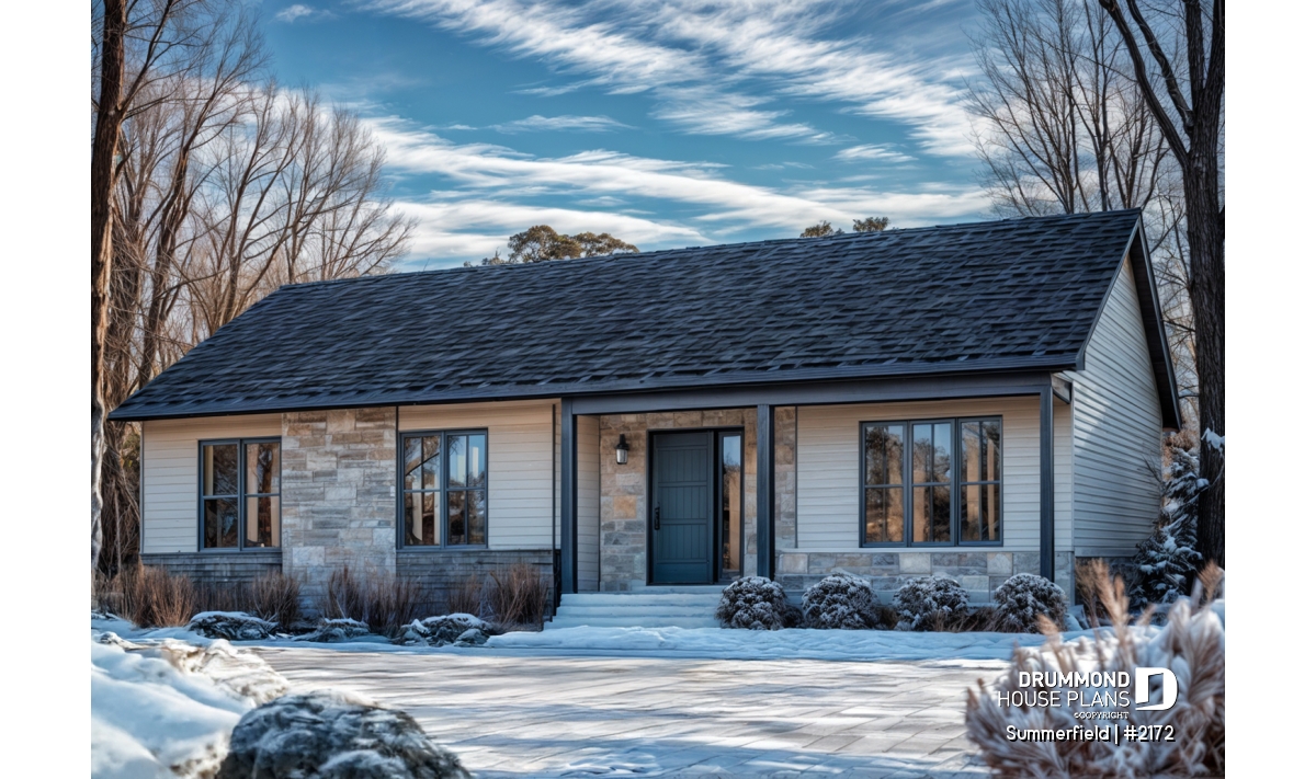 This ranch-style bungalow combines timeless charm, practical design, and affordable construction. Its elegant facade, enhanced with natural stone accents and a subtle, neutral color palette, gives the home a refined yet inviting presence. Compact and well-proportioned, this plan is a perfect choice for self-builders seeking a smart, efficient project that’s both economical and comfortable to live in.