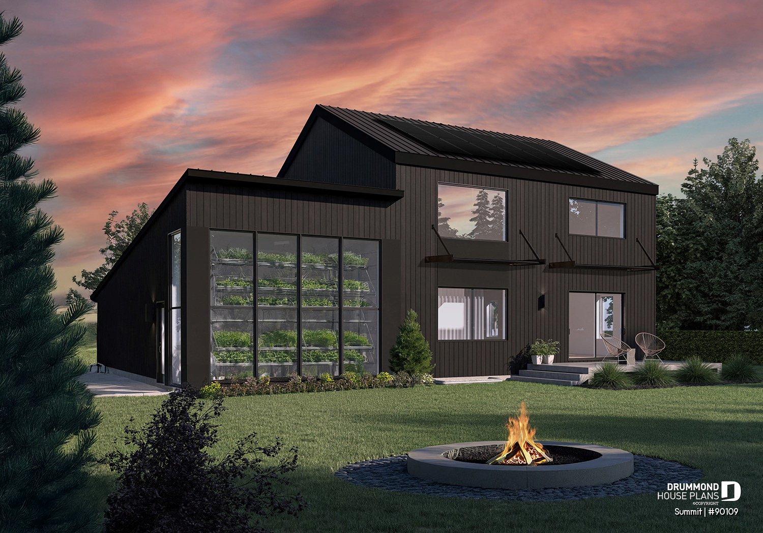 Modern eco-friendly house plan with a greehouse and a private master bedroom and home office on second floor