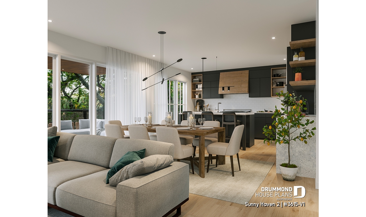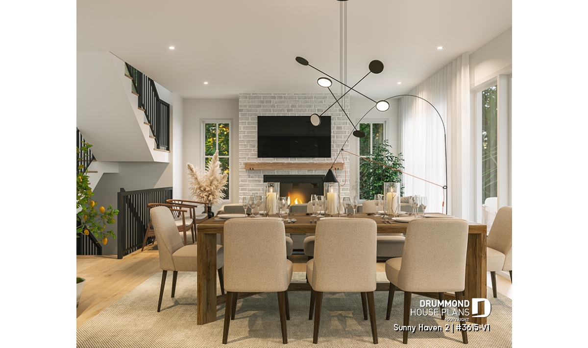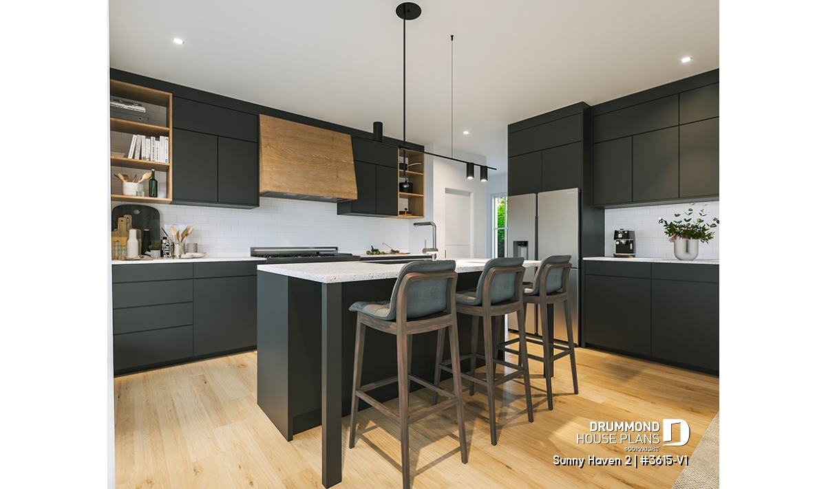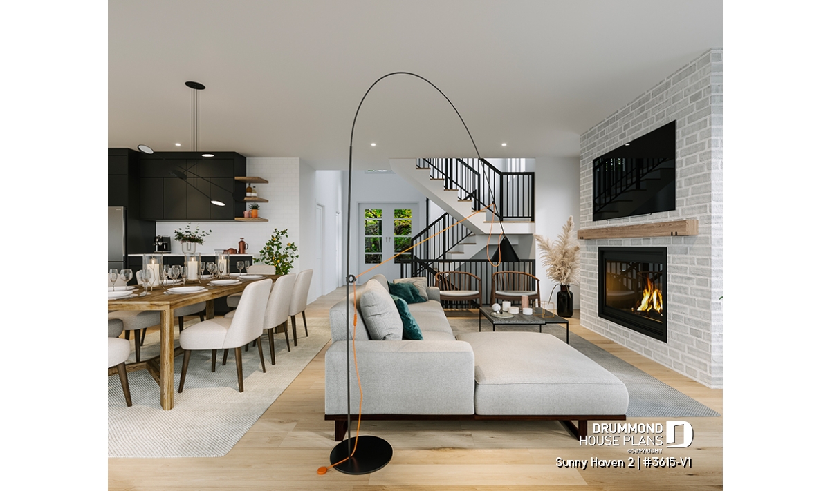 At the heart of Sunny Haven 2 (#3615-V1) lies a bright open-concept living area that brings together the kitchen, dining space, and living room. Designed for connection and flow, this central area benefits from generous windows and a seamless relationship with the outdoor surroundings. The kitchen features a large central island and a walk-in pantry, offering both efficiency and comfort for everyday use. The living room is enhanced by a fireplace, creating a cozy atmosphere ideal for family gatherings and relaxed evenings.