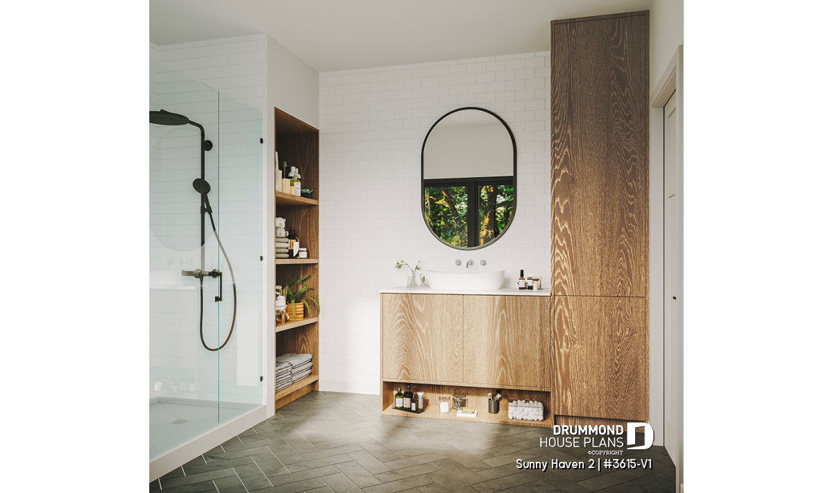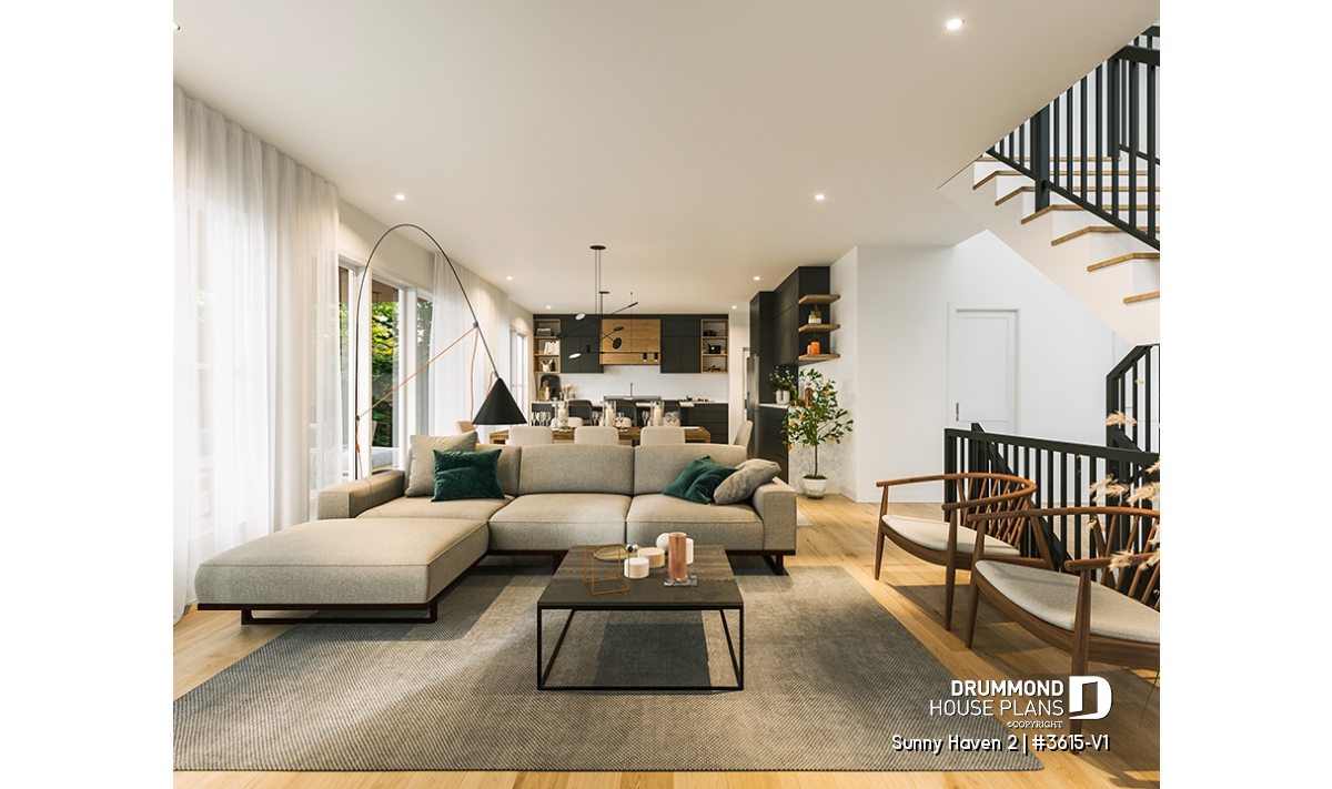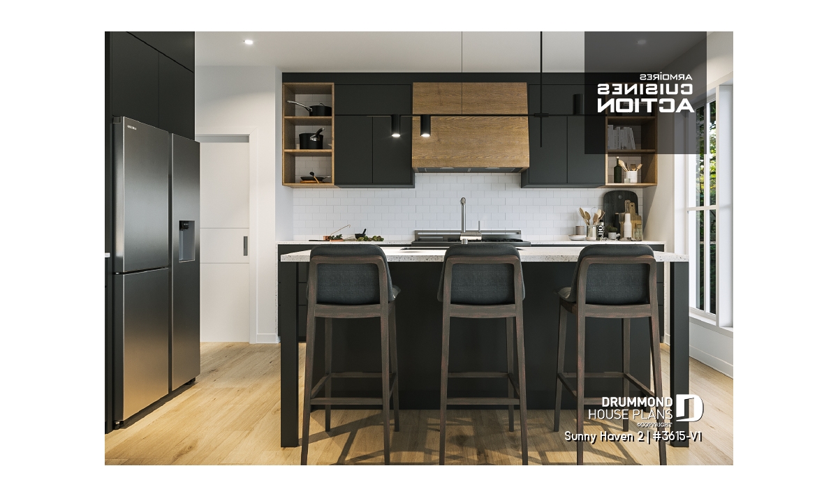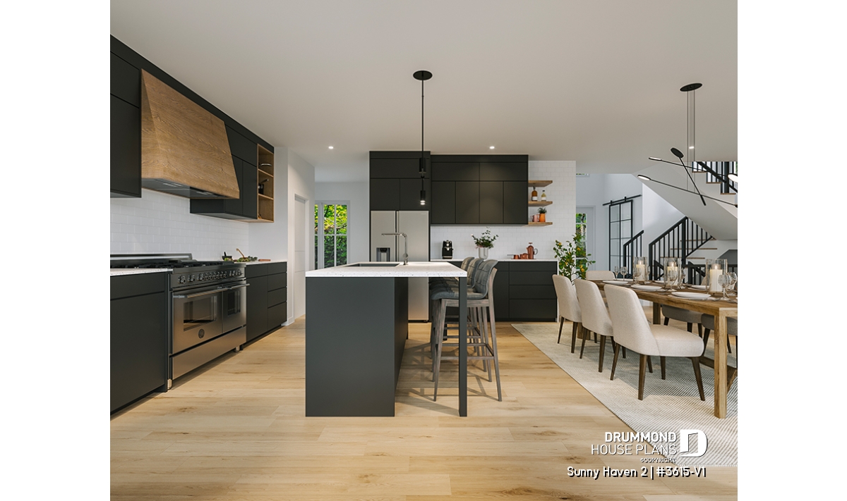 At the heart of Sunny Haven 2 (#3615-V1) lies a bright open-concept living area that brings together the kitchen, dining space, and living room. Designed for connection and flow, this central area benefits from generous windows and a seamless relationship with the outdoor surroundings. The kitchen features a large central island and a walk-in pantry, offering both efficiency and comfort for everyday use. The living room is enhanced by a fireplace, creating a cozy atmosphere ideal for family gatherings and relaxed evenings.