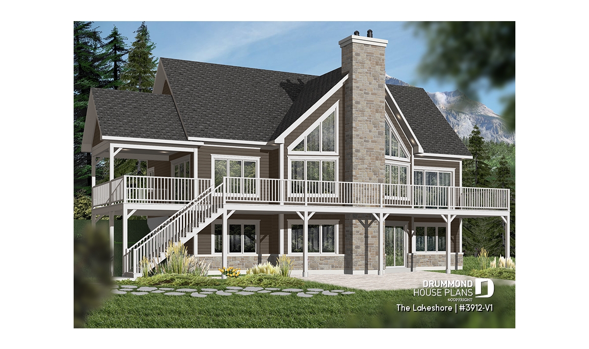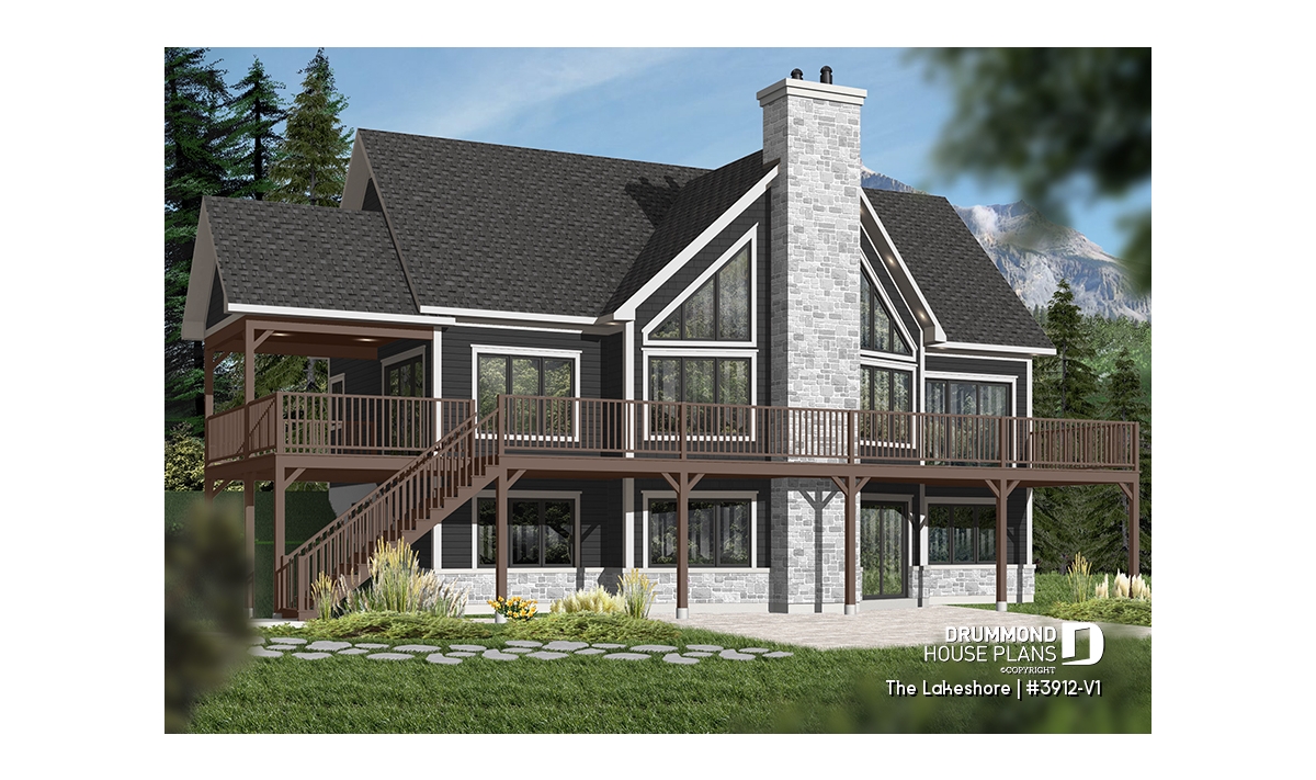 The LAKESHORE (#3912-V1) house plan is a striking Nordic-inspired chalet design offering five bedrooms and three bathrooms, making it ideal for family gatherings or group retreats. Designed without a garage, this layout features a smart orientation: the main entry is positioned on the opposite façade, allowing the rear of the home to fully open toward the landscape through generous windows and a large covered rear terrace.