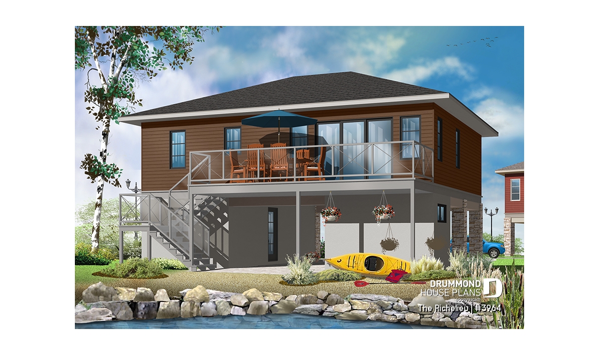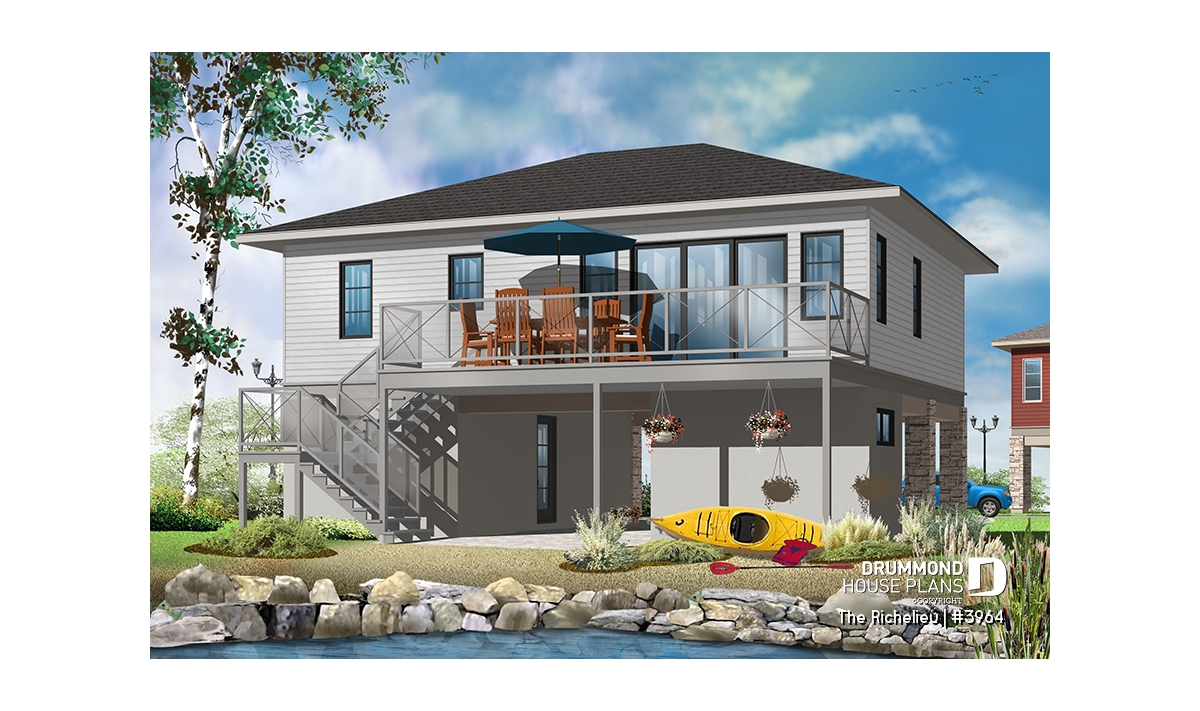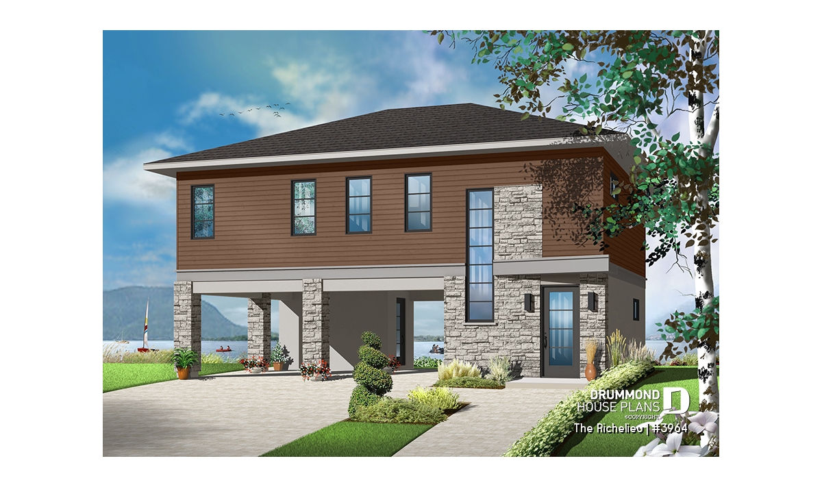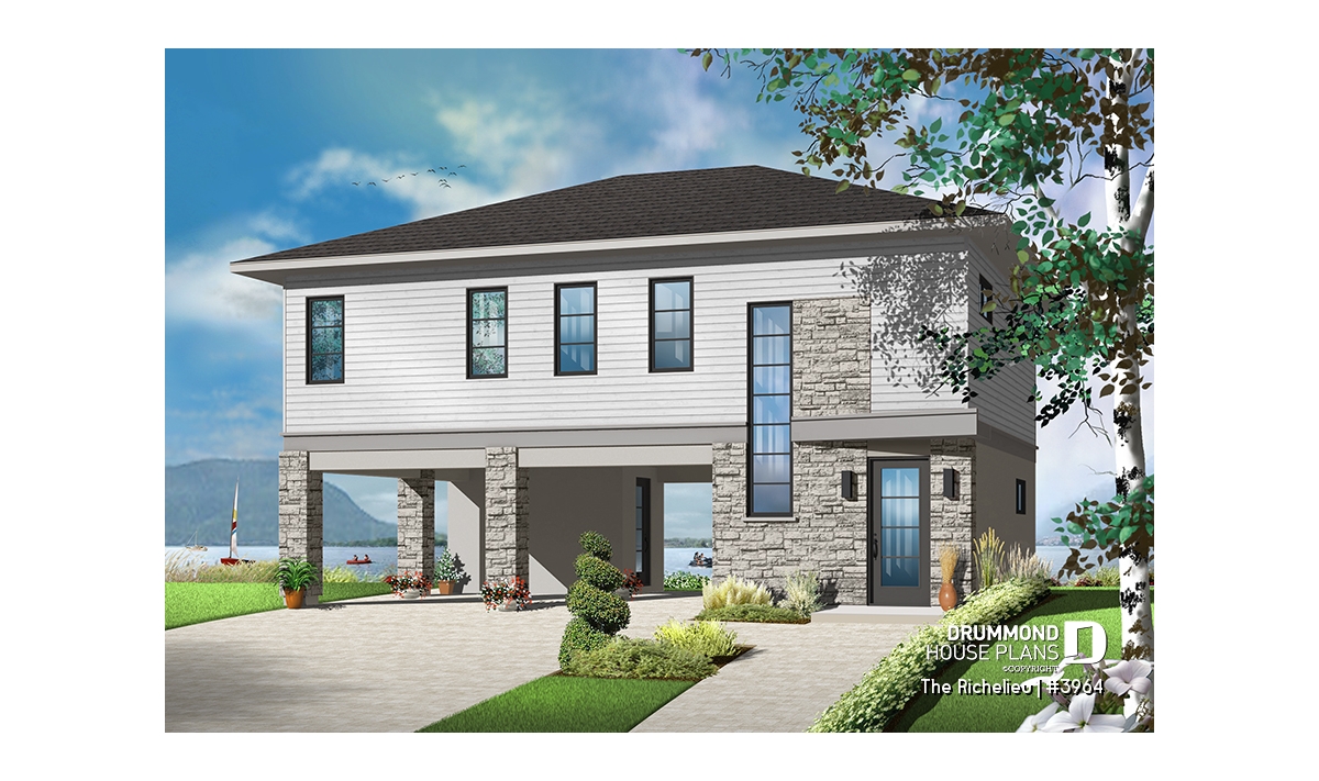2011 was a year of many floods nationwide. Regrettably, this caused incredible hardship and stress to those located on affected floodplains. As homes are repaired or replaced, this risk is top of mind. In response to demand for home plans that would minimize potential damage in the event of a recurrence, we at Drummond House Plans have come up with a design which would be minimally affected by rising waters. In addition, rear oriented living spaces and panoramic views make this home particularly attractive.