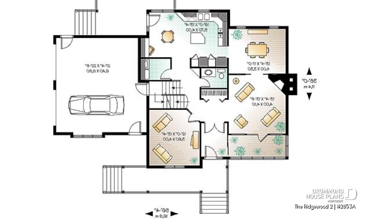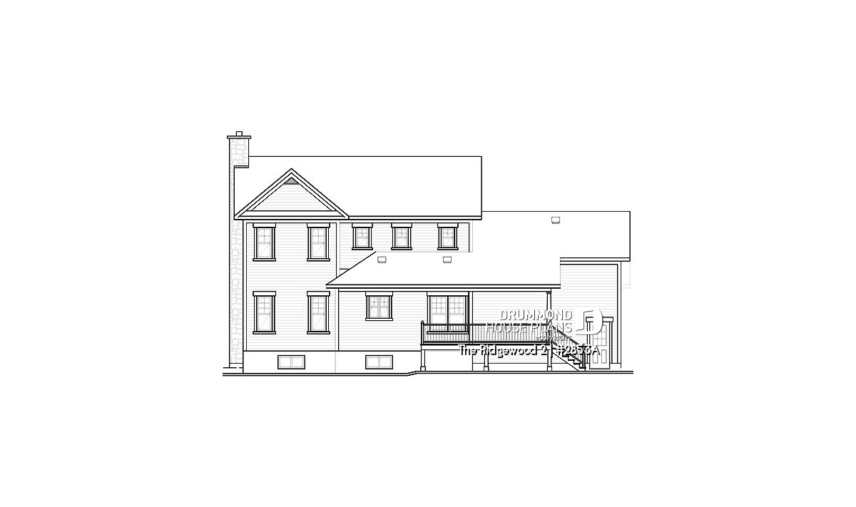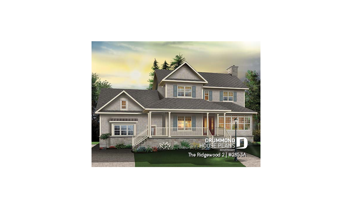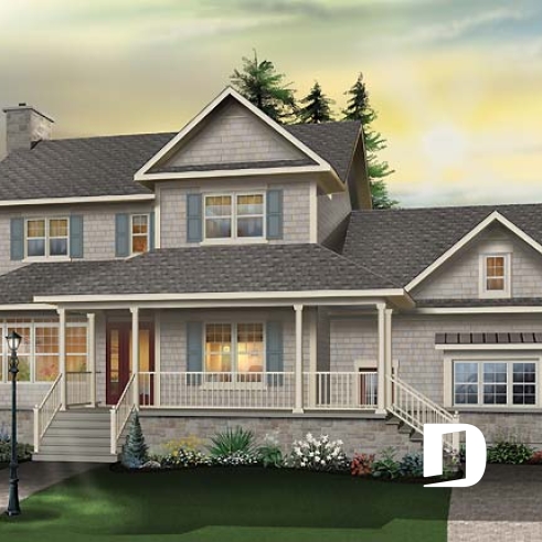 Probably the most pleasing of Drummond Designs’ models on both sides of the Canadian-American border, this model is at the same time elegant, with its large, covered balcony, simple rooflines, well-balanced openings, and discreet by the way the double garage easily blends in.
