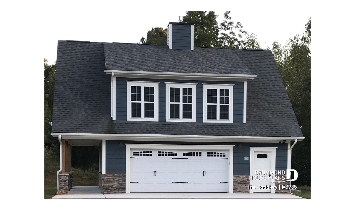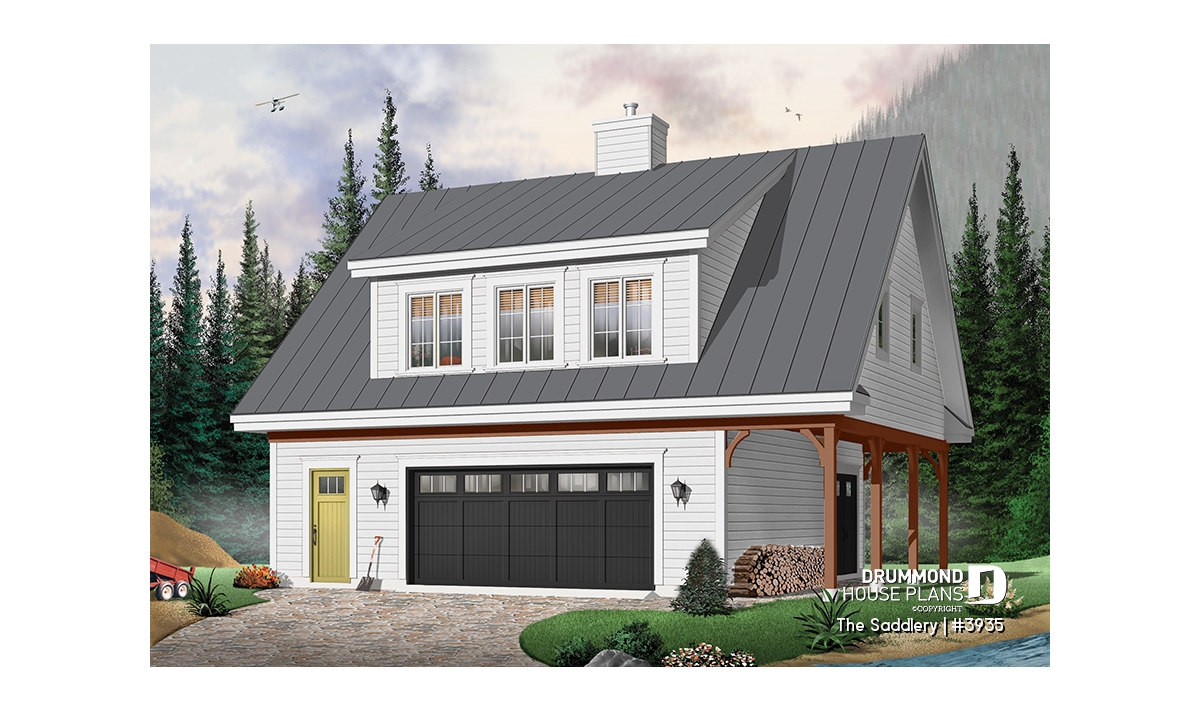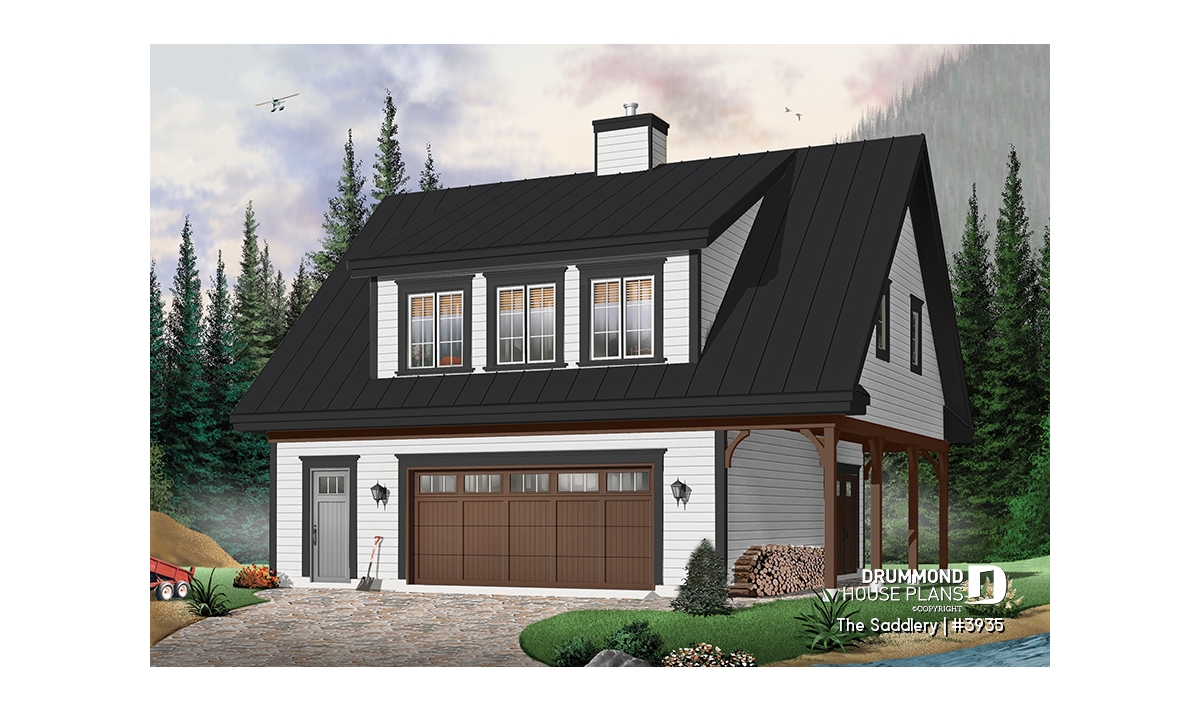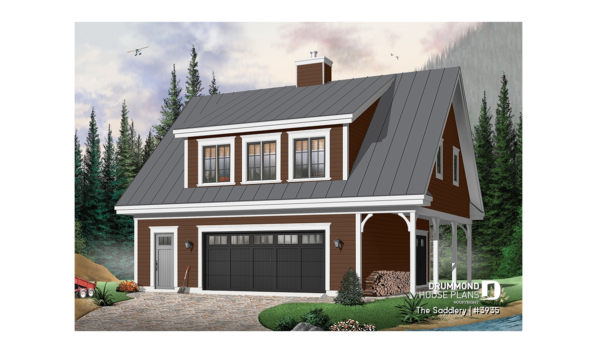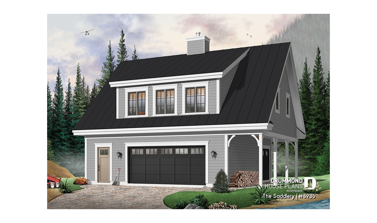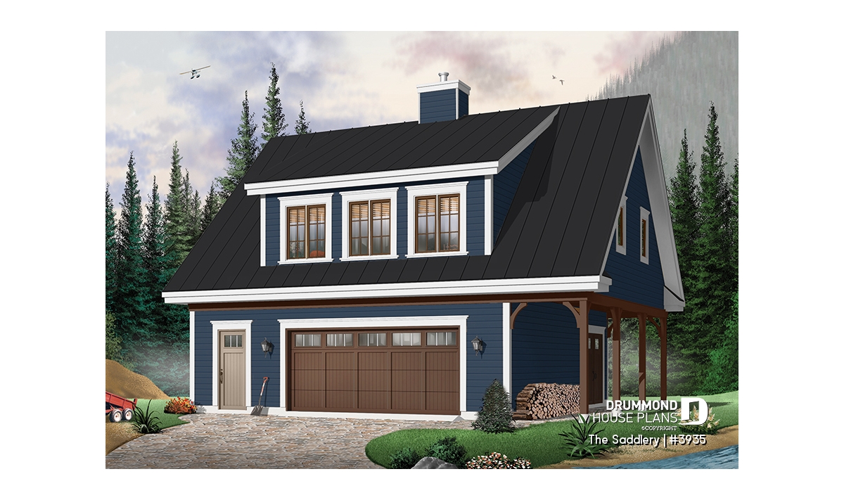 The oversized shed dormer and trio of windows ensure ample light for the suite upstairs. A covered shelter provides enough space to store a few cords of wood safe from the elements and for easy access via the garage.