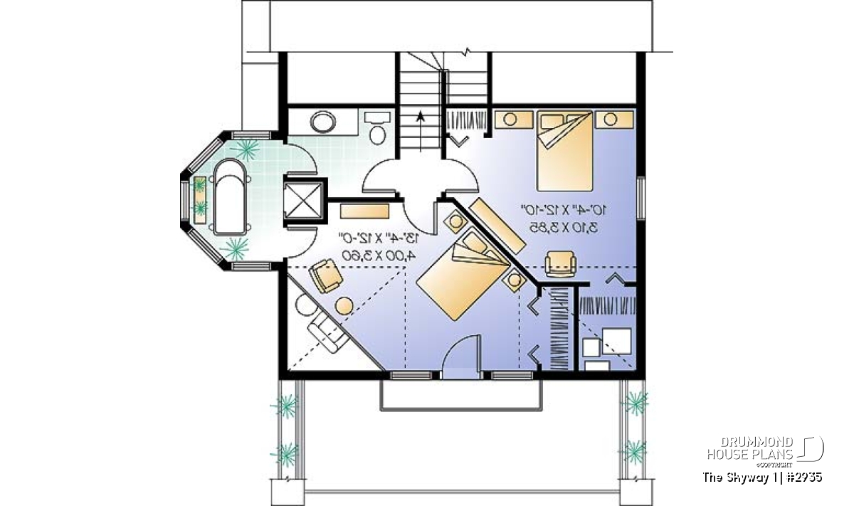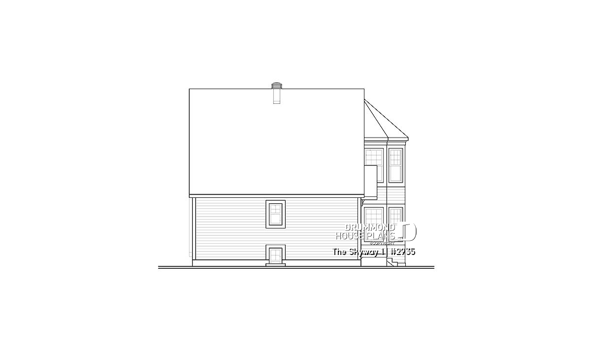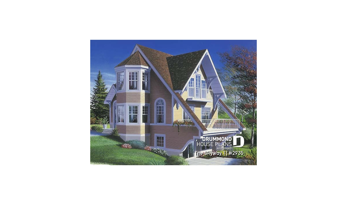 Inside, this originality continues with the layout; on the main level, a large sized foyer, an entirely open activities center embellished by abundant windowing, a hot tub space in the turret, and of a kitchen with central island lunch counter, a “must” in this type of home. On the upper level, this trend continues with a choice of two layouts; the first suggests two bedrooms and a complete bathroom within the turret, and a second one, quite as exceptional and suggesting a unique master bedroom with open bathroom and large bathtub in the turret. To be noted here that the two proposed layouts are included with the plan and that, for each of these, some parts in the mezzanine are attributed to the upper bedrooms so as to occupy these slanted ceiling spaces which are otherwise lost and for even more originality.