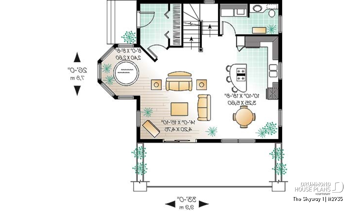 Entirely open activity area on main floor with a spa in the turret. Foyer with a large closet. Two options are included with the plan: one or two bedrooms on the second floor.