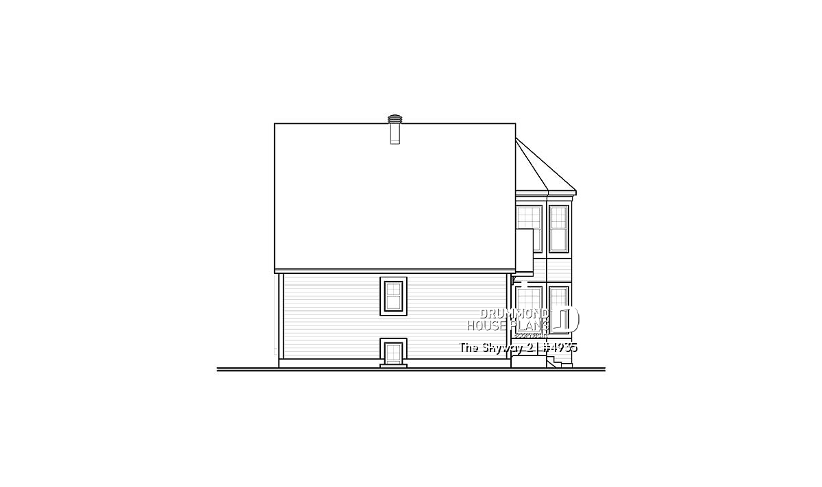 Inside, this originality continues with the layout; on the main level, a large sized foyer, an entirely open activities center embellished by abundant windowing, a hot tub space in the turret, and of a kitchen with central island lunch counter, a “must” in this type of home. On the upper level, this trend continues with a choice of two layouts; the first suggests two bedrooms and a complete bathroom within the turret, and a second one, quite as exceptional and suggesting a unique master bedroom with open bathroom and large bathtub in the turret. To be noted here that the two proposed layouts are included with the plan and that, for each of these, some parts in the mezzanine are attributed to the upper bedrooms so as to occupy these slanted ceiling spaces which are otherwise lost and for even more originality.