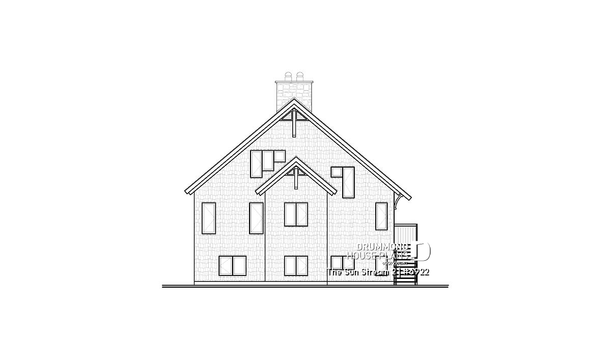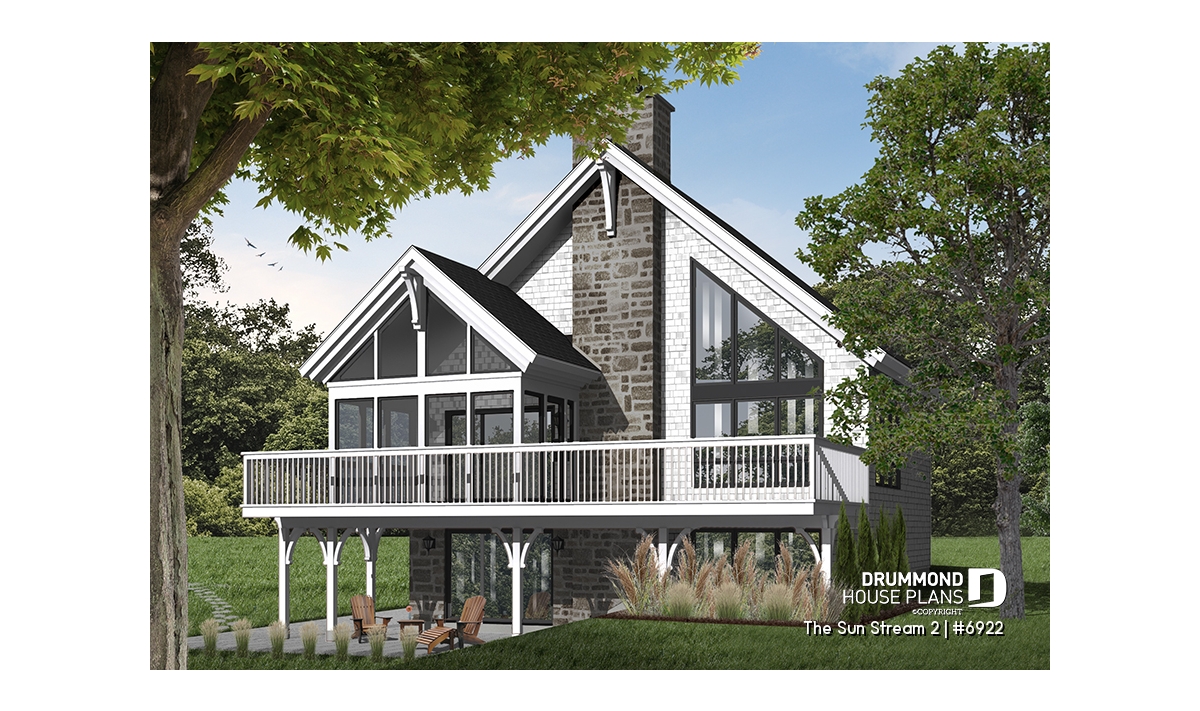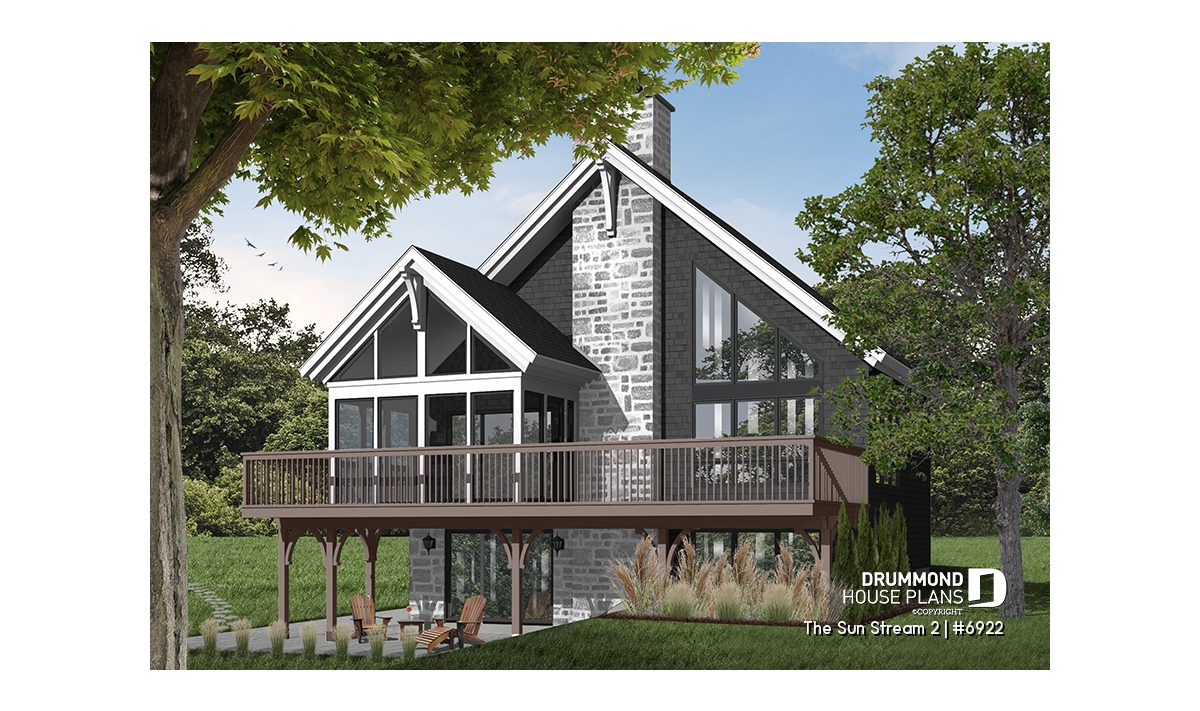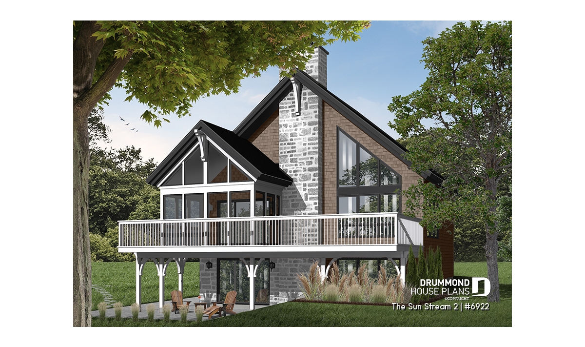 Originated from popular Drummond House cottage plans # 2908, # 2942 and # 2915 (which you can see on drummondhouseplans.com) this simple and rustic chalet house plan # 6922 is an even more comfortable version with and additional 225 square feet spread over the three floors, a desirable mezzanine, a lovable terrace and an increasing popular trend: a screened in porch.