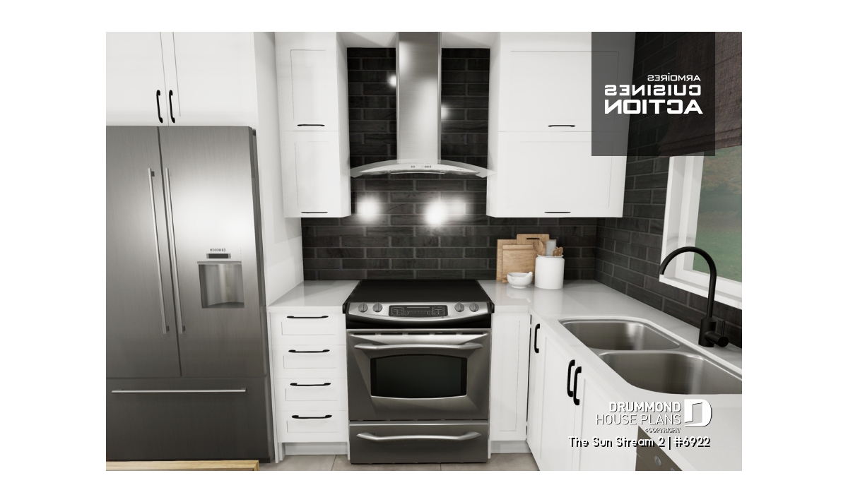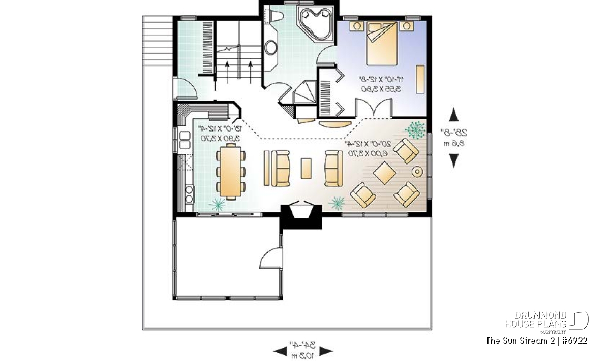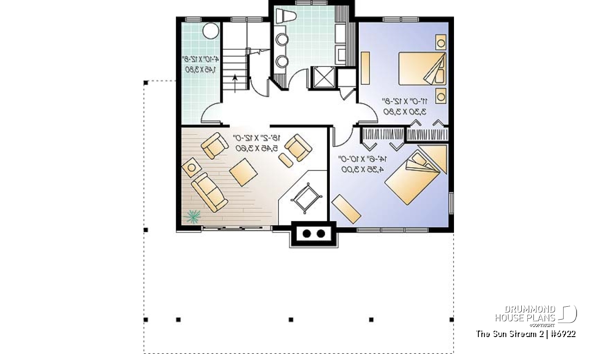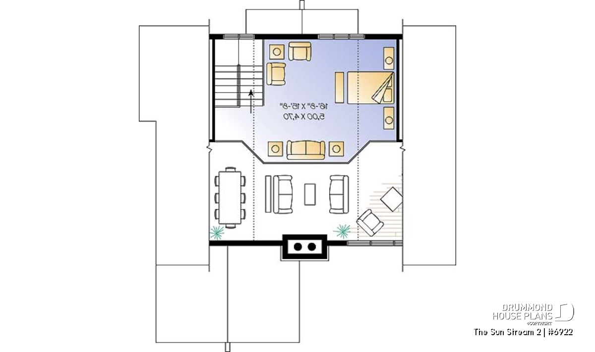 Originated from popular Drummond House cottage plans # 2908, # 2942 and # 2915 (which you can see on drummondhouseplans.com) this simple and rustic chalet house plan # 6922 is an even more comfortable version with and additional 225 square feet spread over the three floors, a desirable mezzanine, a lovable terrace and an increasing popular trend: a screened in porch.