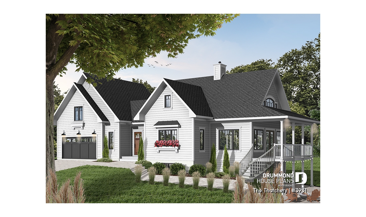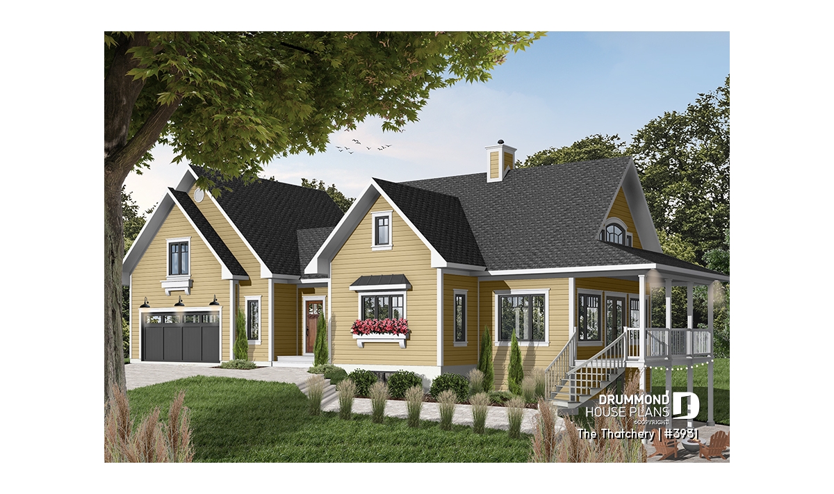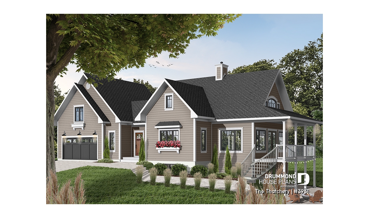 Once again Drummond Designs proves to be listening to its clientele with this interesting variation of a very popular 4-seasons vacation home, by the addition of a double garage and even more liveable space. For you to consider.