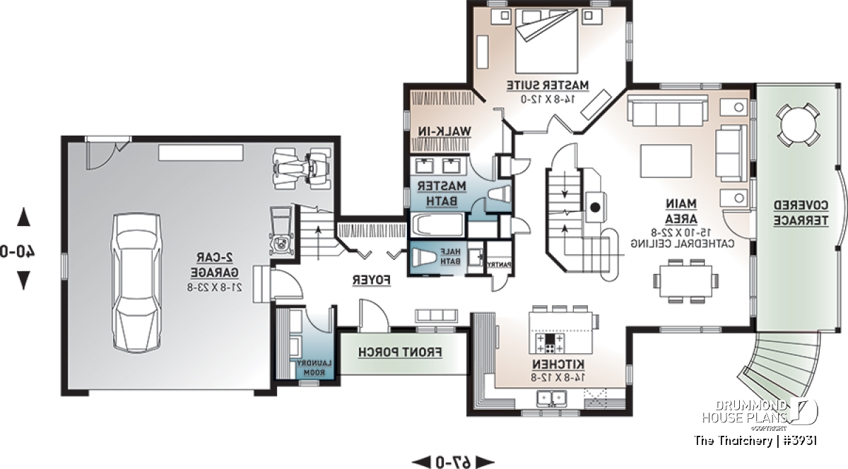 The addition of the double garage bulk to original plan 2939 (which can be viewed on the internet site drummonddesigns.com) thereby adds square footage for the addition of a comfortable entrance foyer, an independent laundry area, a master bedroom suite with private bathroom and large closet, a more than enviable living room/dining room and a kitchen with central island and remarquable lunch counter.
