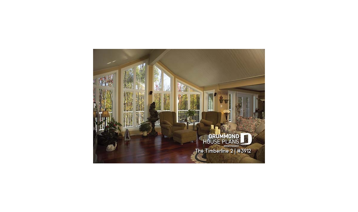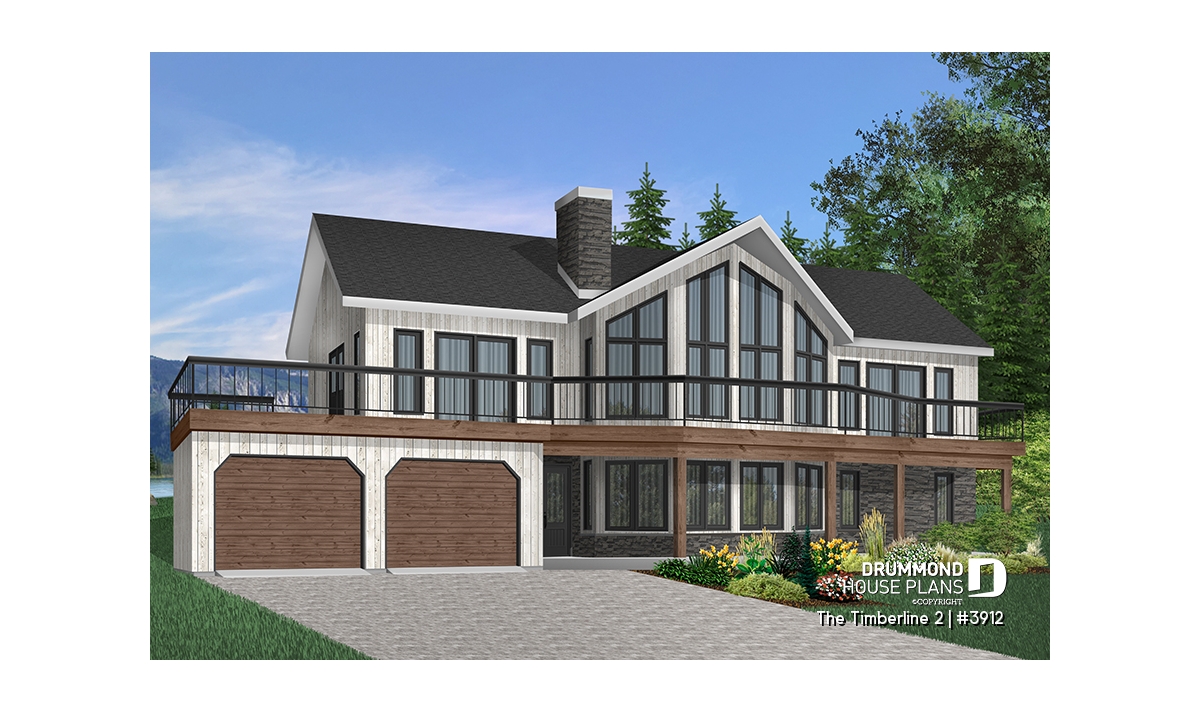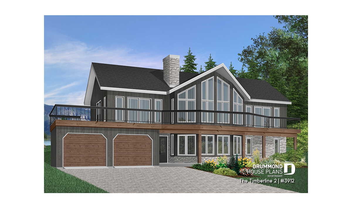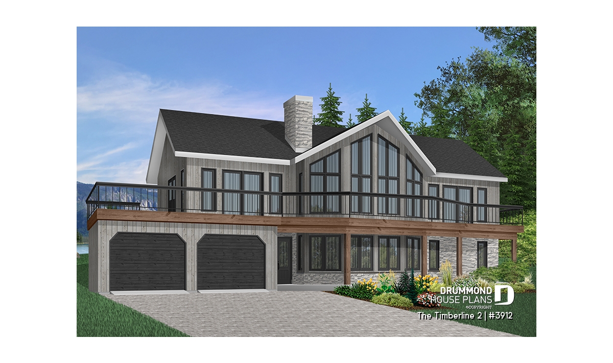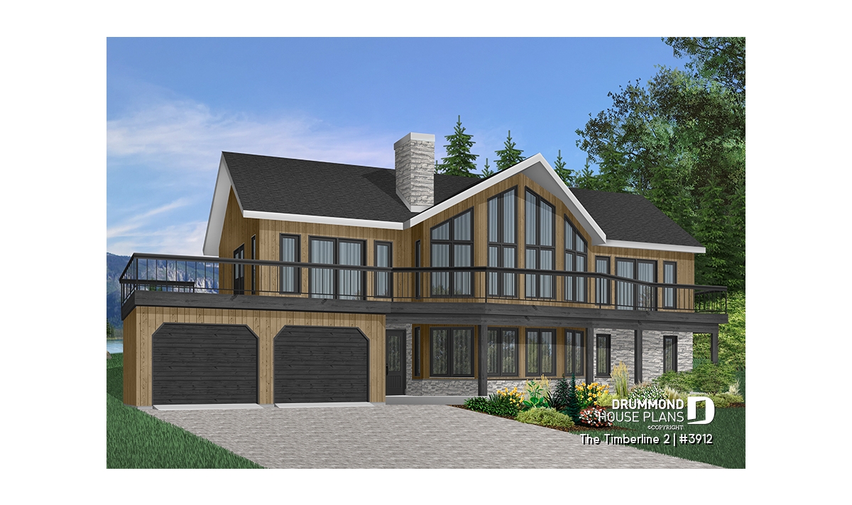 While many chalet-type homes have a panoramic view towards the rear, this one has a different orientation with a panoramic windowed façade. Ideal for a sloping lot, with a lot grading up towards the rear of the house, the main level becomes the basement and the second floor becomes the main level.