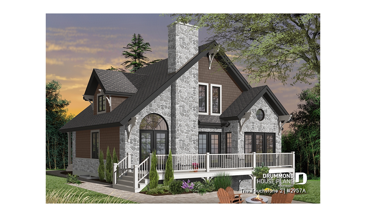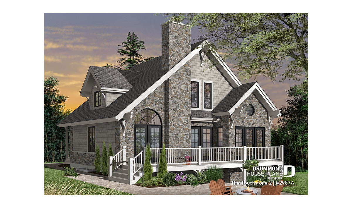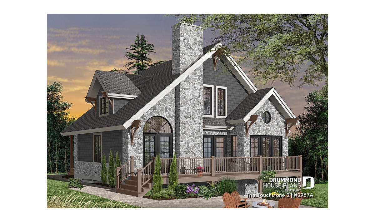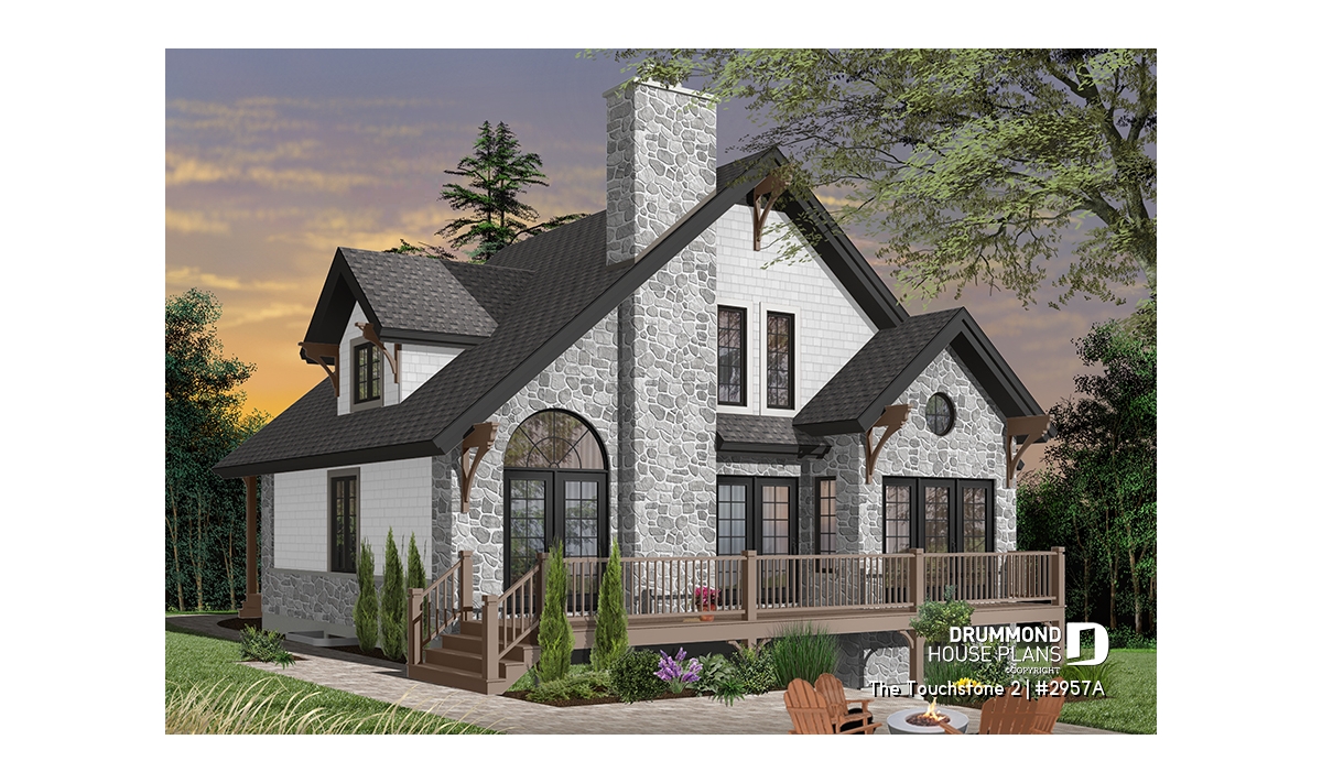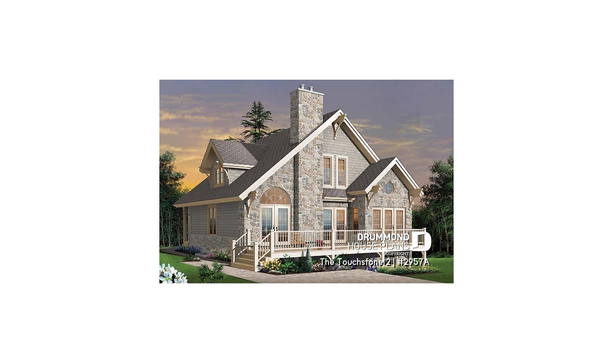 An ideal house for any time of year. Warm and inviting, it does not skimp on windows and offers a remarkable blend of materials, sloping roof, decorative mouldings and angles. The exterior is just a hint of the charm within.