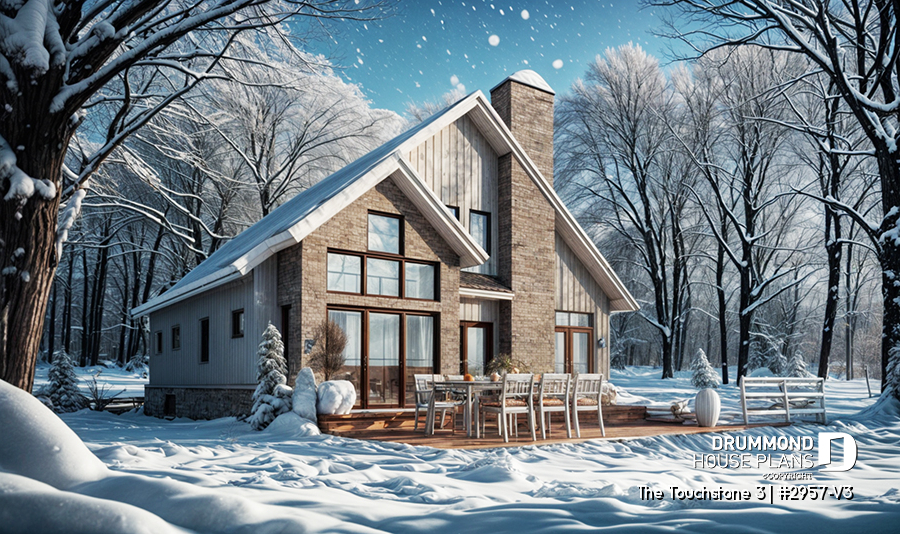 Nordic Chalet-Style Home Plan – 3 Bedrooms, Mezzanine and Central Fireplace