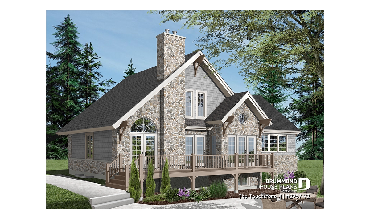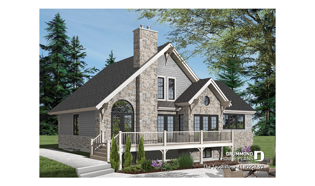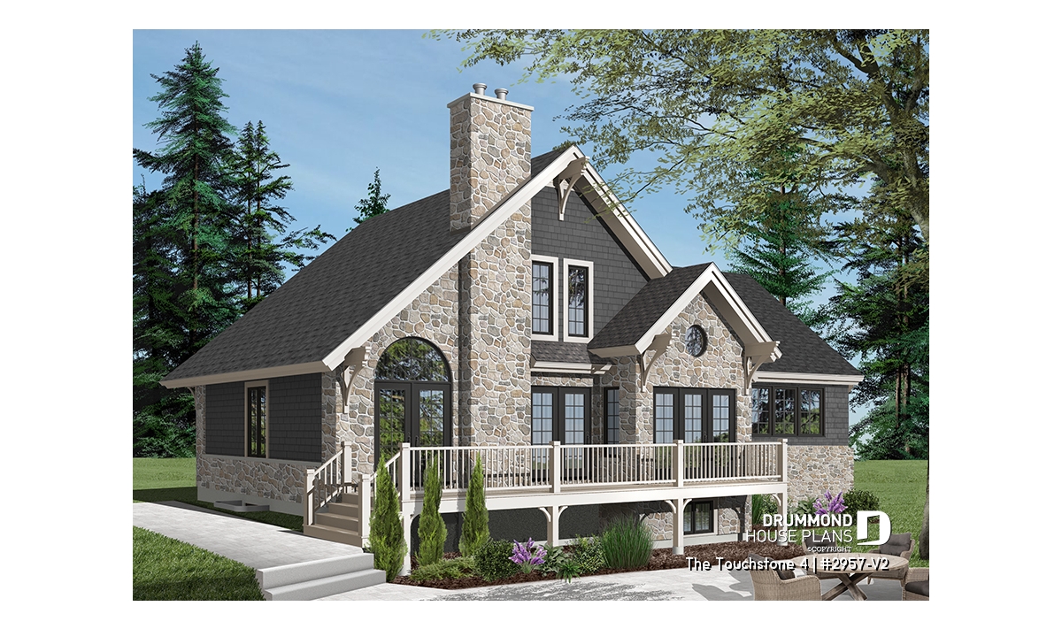 The THE TOUCHSTONE 4 (#2957-V2) house plan features a rustic chalet-style design with garage, created to deliver exceptional natural light and a strong connection to the surrounding landscape. Well suited for wooded lots or waterfront settings, this home emphasizes open spaces, panoramic views and a warm architectural character.