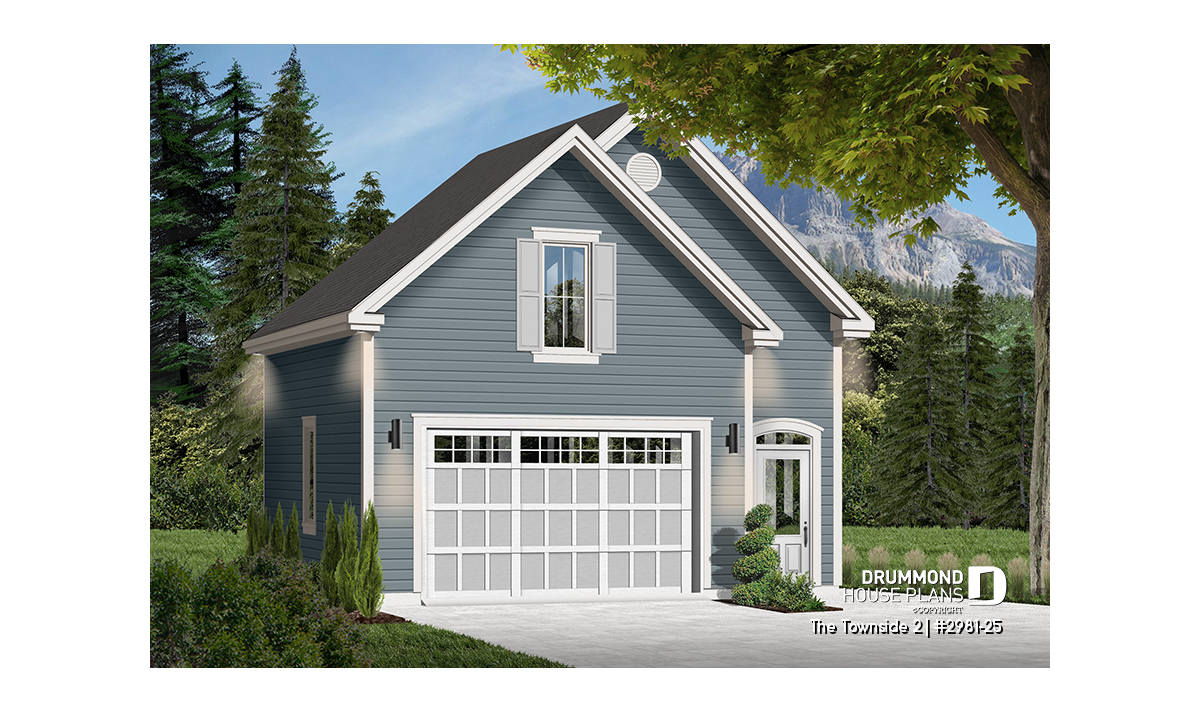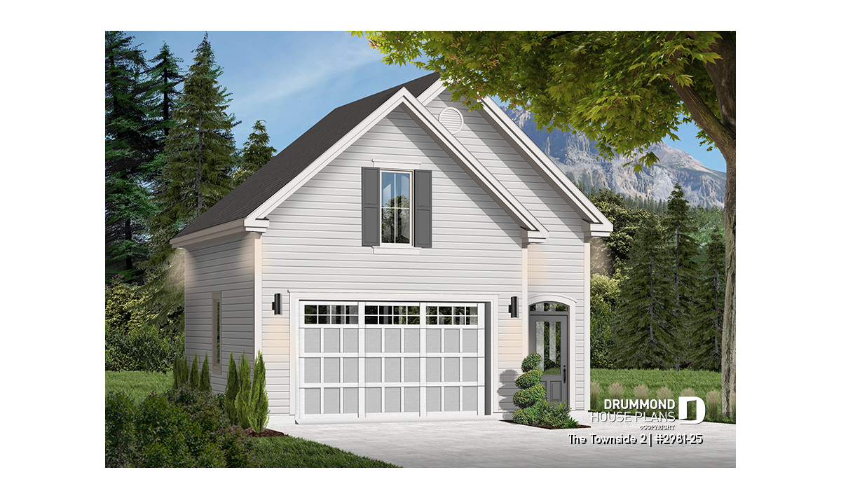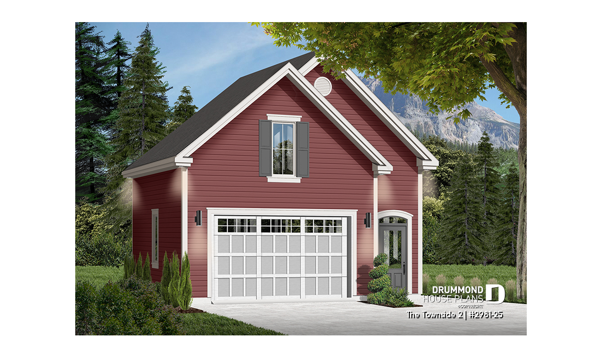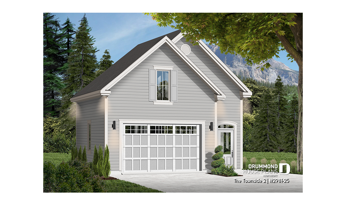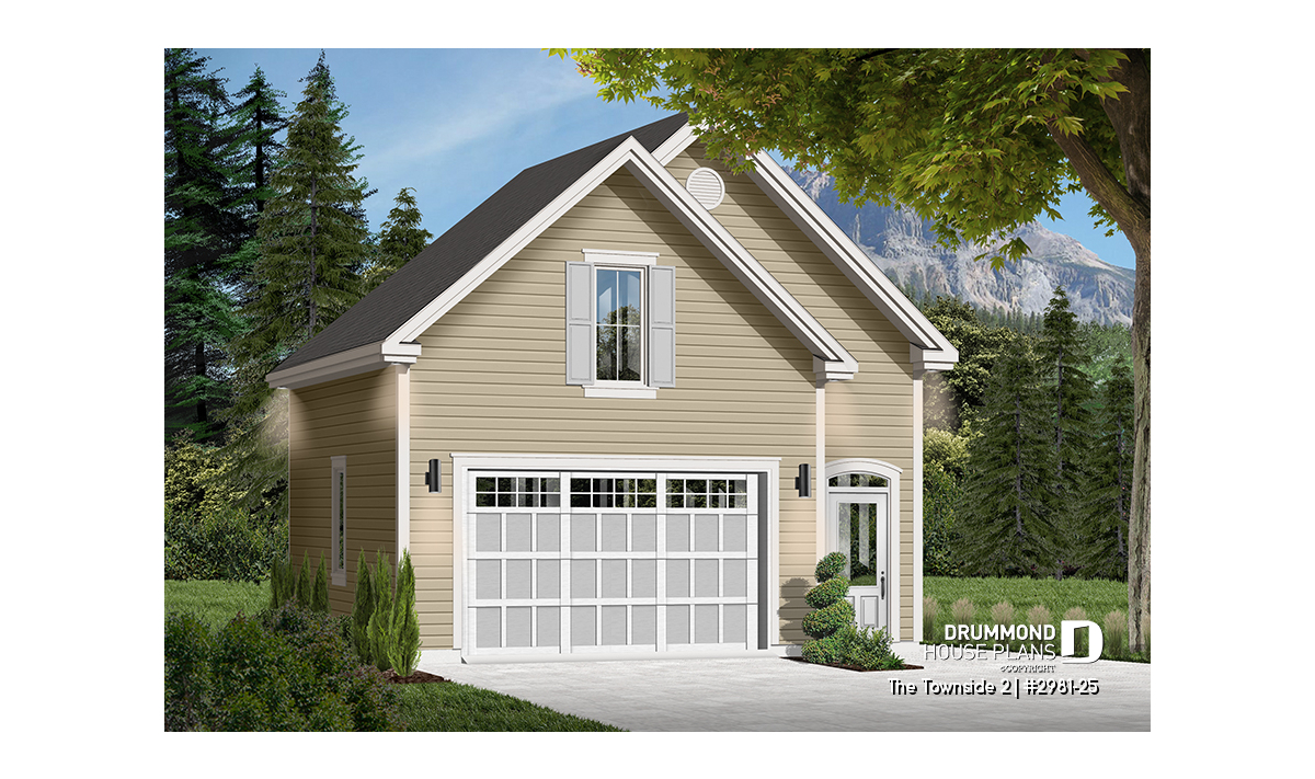 Large one-car garage plan with storage room above.